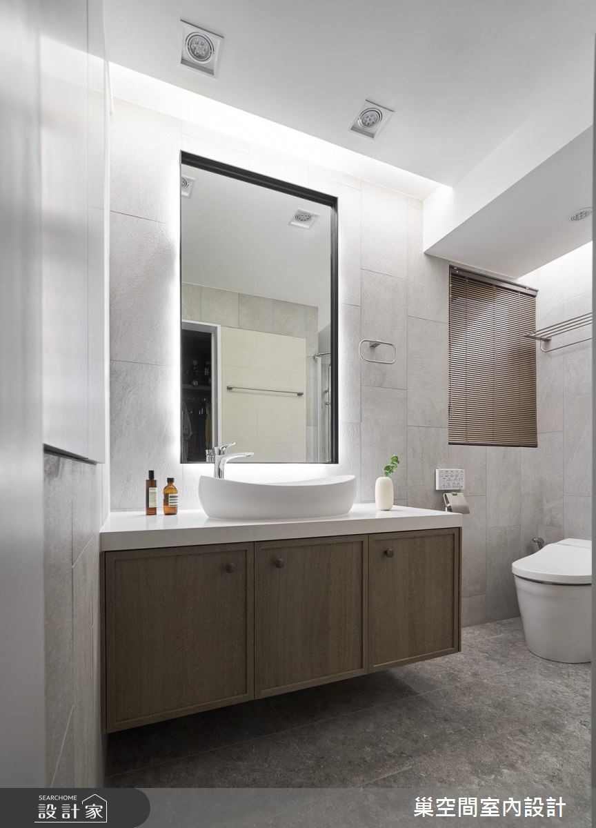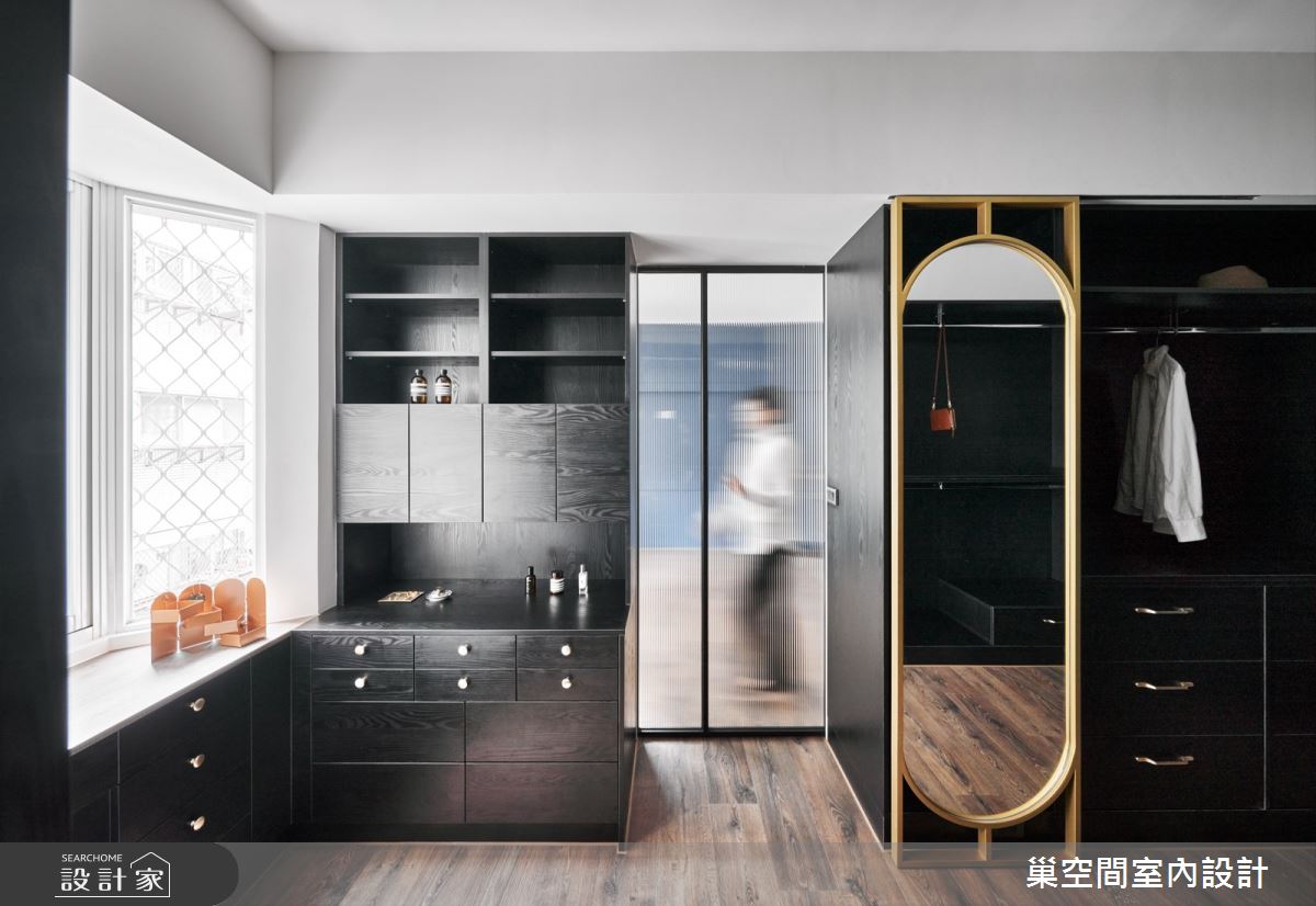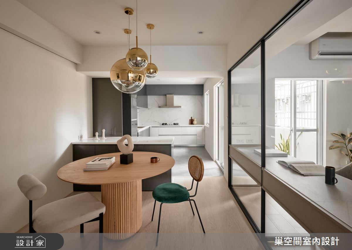 巢空間室內設計以鍍鈦鐵件、烤漆鐵件、鏡面、Egger系統櫃、進口花磚、超耐磨木地板、Dulux乳膠漆的搭配應用,呈現現代風居家氛圍,將此間30坪、三房、單層、老屋(31~40年)打造成舒適愜意的家庭空間,完成2位大人全家人的夢想之居。