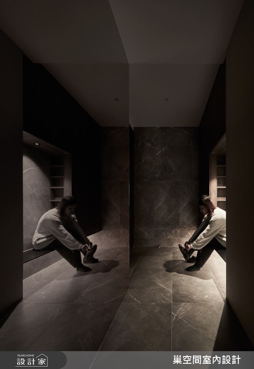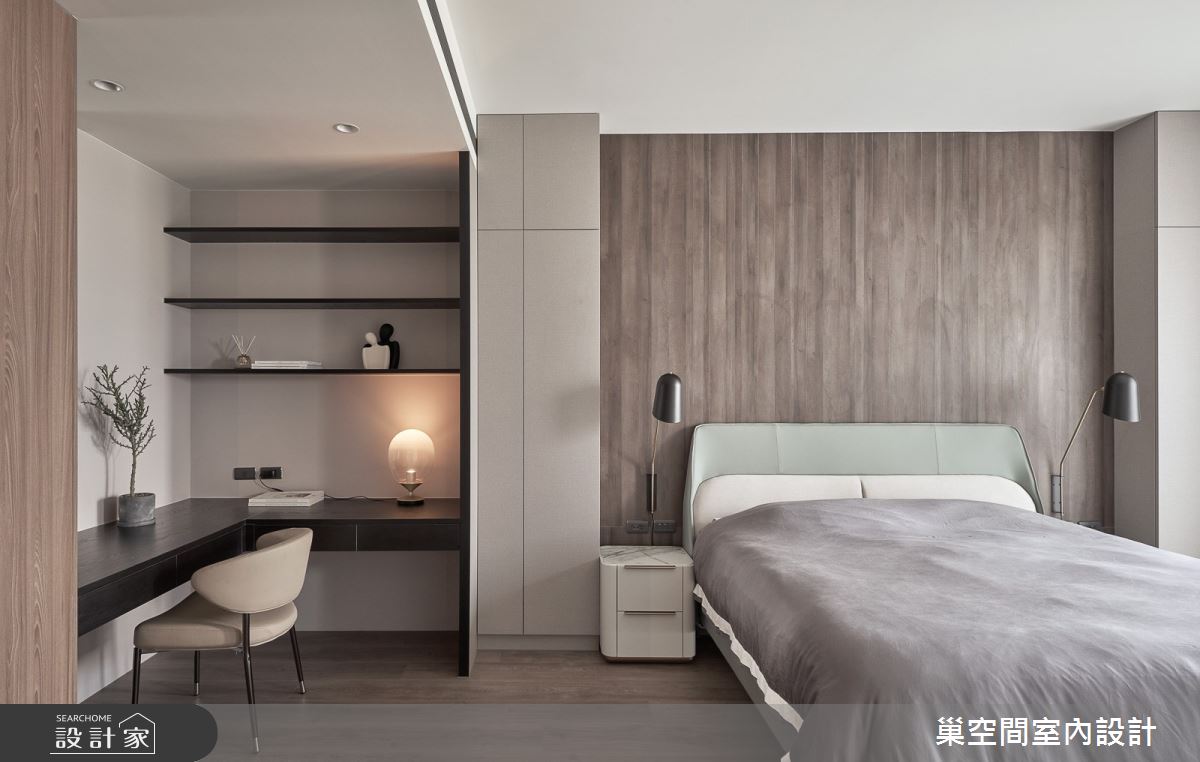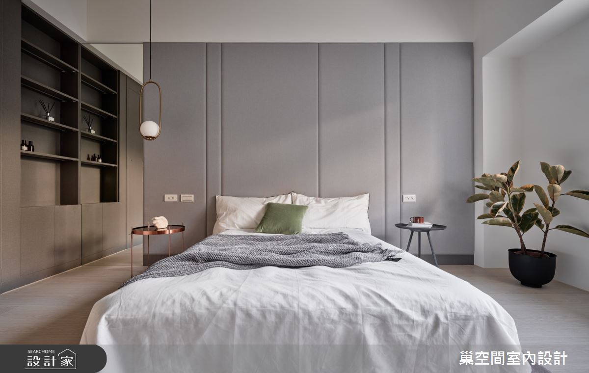 巢空間室內設計以無縫地坪塗料、藝術塗料、烤漆鐵件、大理石紋板、鏡面玻璃、Pergo超耐磨木地板、Egger系統櫃的搭配應用,呈現現代風居家氛圍,將此間30坪、三房、單層、中古屋(5~15年)打造成舒適愜意的家庭空間,完成2位大人全家人的夢想之居。