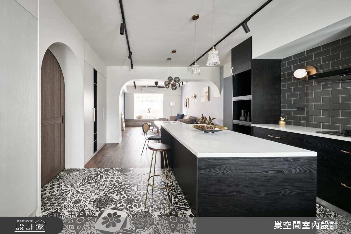 個性不同的夫妻帶著兩個小男孩,入住這間 35 坪的現代風住宅,而設計師運用義大利進口系統板材、特色花磚等建材,加上重整為 3 房 2 廳 2 浴的格局,在居家具體呈現夫妻衝突又互補的相處美學。 玄關在轉折處透過邊角導圓的方式,引導通向公領域的動線,同時也保護到孩子的安全,降低他們嬉戲時撞傷的機會。公共空間拆除廚房的舊有隔間,串聯起客廳、餐廳與廚房,使光線可以順著腳步恣意流動其中,營造明亮開闊感。客餐廳鋪設通透的石材紋路地坪,搭配電視牆的大理石肌理,襯托出屋主獨特的時尚品味。 由於客廳有橫樑壓迫的問題,因此設計師利用線條的堆疊與進退面的層次,放大整體空間感。ㄇ字型廚房則在牆壁和地坪都妝點幾何花磚,凸顯女主人對於北歐風的愛好,又不影響居家的俐落感受。走廊藉由燈帶設計帶領著家人緩步進入私領域,主臥在床頭選擇古典線板裝飾,並隱藏後方的收納機能,使寢臥跳脫出優雅柔和的調性。 小編的最愛 兒童房設置大面積的收納櫃,黃藍粉色塊在視覺上跳躍,呼應男孩們的活潑特質,而溜滑梯後方的童趣壁紙則營造出父母講述睡前故事的美好環境,為孩子開啟充滿創造力的夢境歷險。