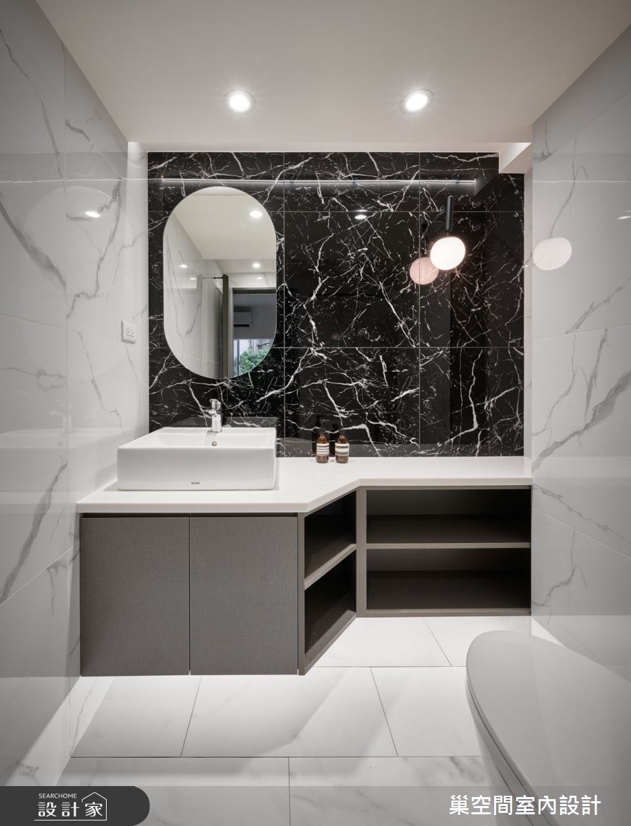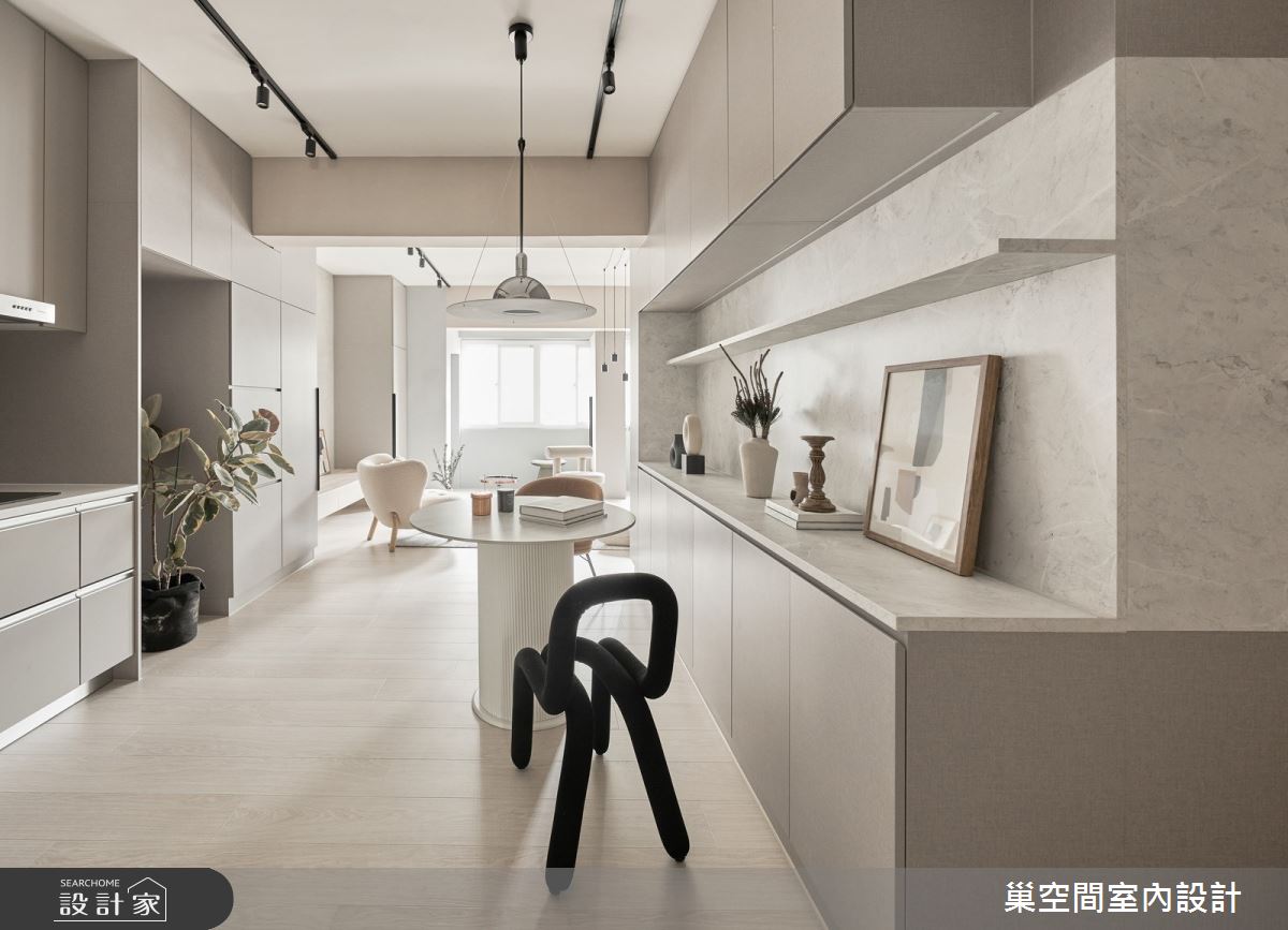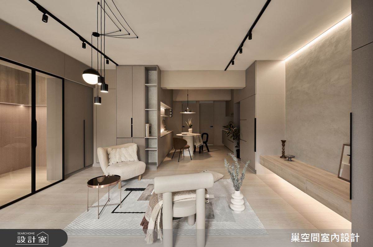 巢空間室內設計以無縫地坪塗料、藝術塗料、烤漆鐵件、大理石紋板、鏡面玻璃、Pergo超耐磨木地板、Egger系統櫃的搭配應用,呈現現代風居家氛圍,將此間20坪、兩房、單層、新成屋(5年以下)打造成舒適愜意的家庭空間,完成2位大人、1位小孩全家人的夢想之居。