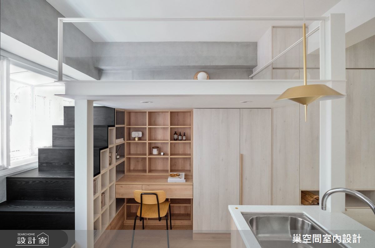 本案為巢空間室內設計的12坪混搭風中古屋(5~15年)設計作品,格局為複層一房的居住空間。居住成員包含2位大人。全室建材的搭配,應用珪藻土、特殊藝術塗料、烤漆鐵件、鏡面、進口花磚、Egger系統櫃、Pergo超耐磨木地板、Dulux乳膠漆,展現溫馨的居家氛圍。