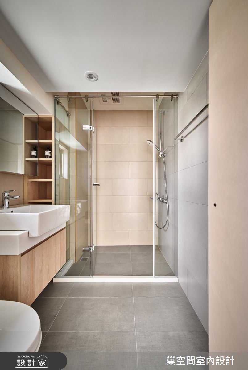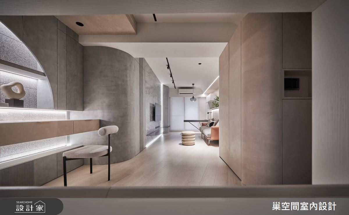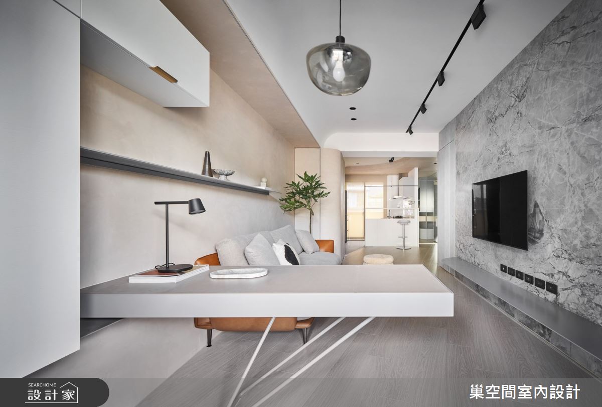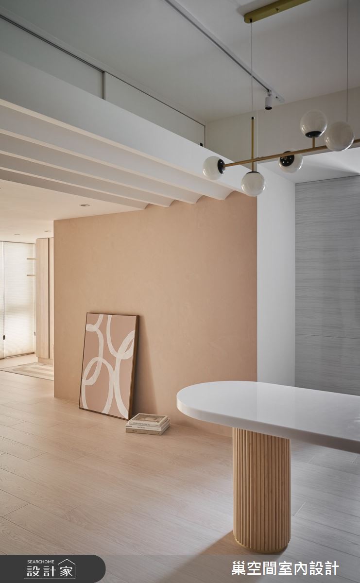 巢空間室內設計以無縫地坪塗料、藝術塗料、烤漆鐵件、大理石紋板、鏡面玻璃、Pergo超耐磨木地板、Egger系統櫃的搭配應用,呈現現代風居家氛圍,將此間20坪、兩房、單層、新成屋(5年以下)打造成舒適愜意的家庭空間,完成2位大人、1位小孩全家人的夢想之居。