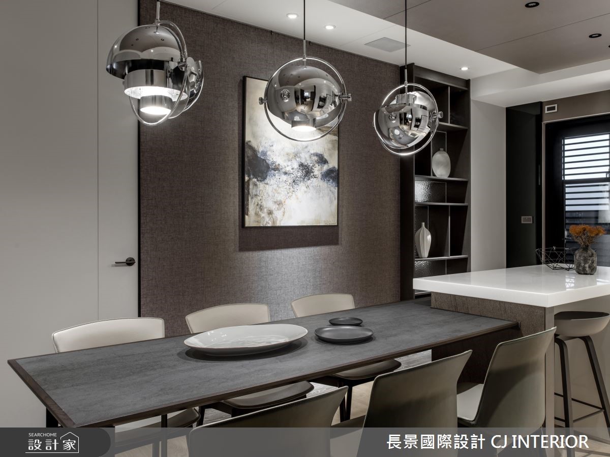 長景國際設計以油漆、乳膠漆、不鏽鋼、鐵件、鍍鈦金屬、木作貼皮、鋼刷木皮、系統板材、大理石、木百葉、賽麗石、石材的搭配應用,呈現現代風居家氛圍,將此間62坪、兩房、單層、新成屋(5年以下)打造成舒適愜意的家庭空間,完成2位大人全家人的夢想之居。