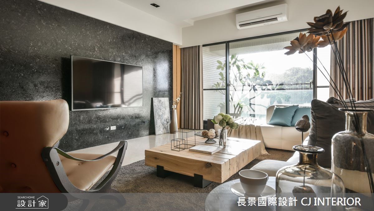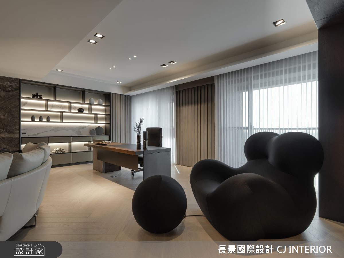 96 坪大宅空間,設計師因應業主的期望,將窗景打造成長型的量體,變成流動的畫面,讓室內可隨時收進窗外的美好景觀,時刻感受到光影與空間的對話;玄關領域,則利用隔柵的線條做延伸,客廳區域則在電視主牆安排長型的收納櫃,左側則是展示櫃,大量引用長型的量體與垂直的線條作交錯,形塑俐落的空間表情,延伸出新的秩序;材質上採用鐵件及皮革表現,搭配大理石襯底,營造低調內斂的質感,加上全室木地板及木百葉的溫潤鋪敘,沉澱出美好的人文氣氛。