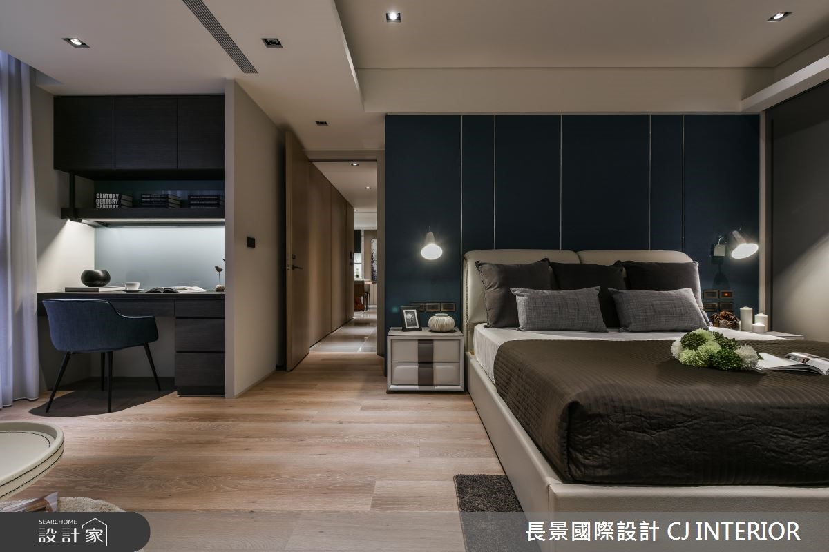 80坪現代風大宅,設計師讓空間適度留白,並引用窗外採光,延展出室內的光影流動,强化空間內的延伸放大感,同時刻意降低過多的線條設計,讓居住者可在簡約架構中,享受放慢腳步的恬靜氛圍,沙發後方壁面置入了洗鍊的鍍鈦鋼板,建構大方的幾何線條,搭配明亮輕盈的舒適色塊,並運用沙發抱枕做跳色搭配、點亮視覺,製造空間的些許摩登感,顯現居者的生活品味;私領域,則藉由沉穩端莊的軟裝,給主臥注入深邃的寧靜,結合素淨基底與百葉、線板等線條修飾,打造出愜意的臥室氛圍。