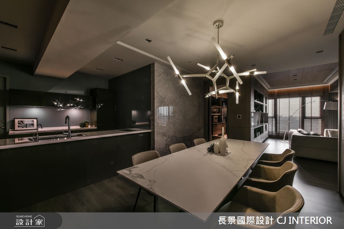 111 坪的現代風大宅,設計師給適度留白,保留居住者與場域的互動空間,同時存有與展品對話的餘裕;整體公共空間視線較通透開放,以半腰電視主牆為過度場域,界定客廳與餐廳兩個空間,如實呈現屋主嚮往的低調細緻生活;空間設定以灰階色調材料為主,烘托出低調的質感;客廳沙發背牆,採用半高的石材拼貼趣味,透過一側的灰玻相呼應以延伸視覺、放大空間,再搭配金屬色擺飾及白色滾邊的墨藍色沙發,點綴出輕盈而穩重的調性;電視主牆則以對比的墨藍色鋼刷木皮烤漆形塑框景,構成空間中的視覺焦點。