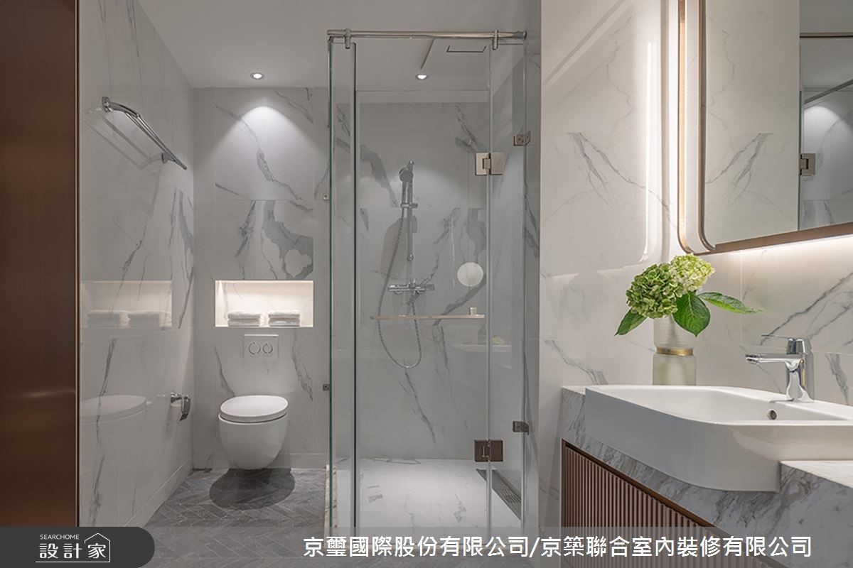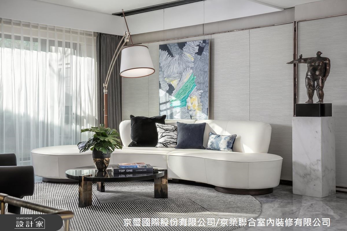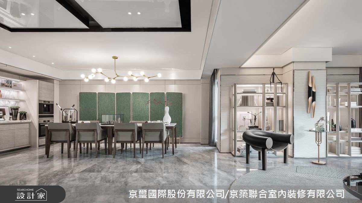由京璽國際股份有限公司精心規劃的57坪四房住宅空間。因應屋主需求,設計師運用現代風作為主軸,搭配壁紙、木地板、鍍鈦金屬、木作貼皮、磁磚、石材、玻璃,打造全家人的夢想家居。