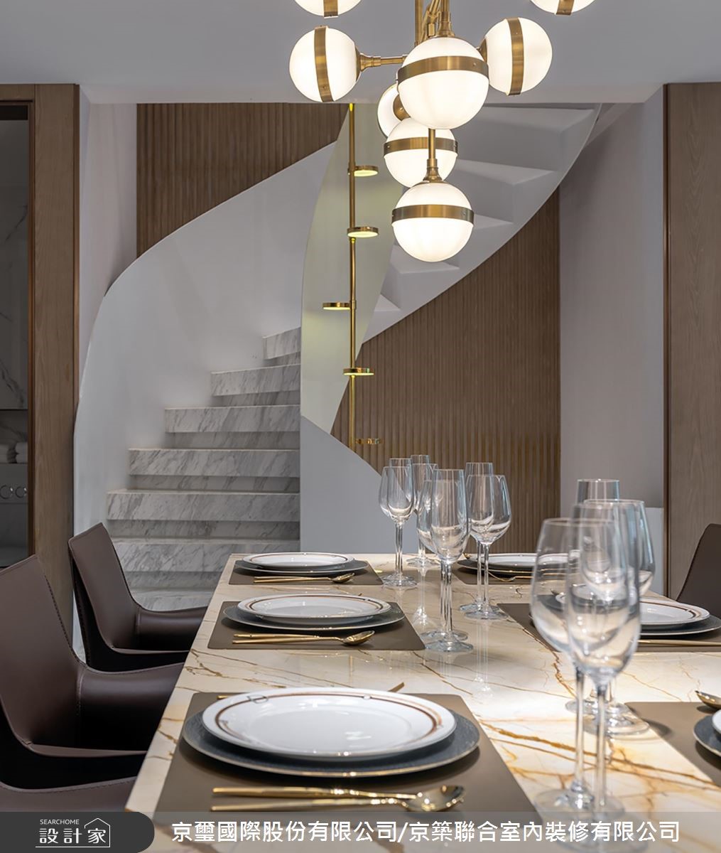 本案為樓中樓空間,公領域於入口玄關建立藝術光廊,並適當挪動廚房隔間、打造社交廚房,將餐廳及客廳融為一體,締造美好生活景象,同時刻意將電梯及富有藝術美感的造型樓梯設立於兩側,把空間核心開放出來,讓整體動線與視野更加通透開闊,彰顯花園別墅的大器感,快跟著小編一起來看看吧! 一樓廳區地坪,採用來自義大利高貴石材黃金魚肚白,由玄關延展入內,以分割拼接的細節突破格局限制,同時導入溫潤灰橡木大字拼木地板,藉由不同材質的面向,劃開場域界線;立面造型,採用淺灰色系水洗清玫瑰木皮應用於左側電梯, 呈現穩定的人文氣息;家具部分,則礙於本案受限屬狹長格局,刻意於花園窗景前擺設弧型沙發,配搭圓弧型的地毯,平衡整體視覺美感。 二樓來到卧室空間,藉著晨起曙光迎接自然光景,並通過佈局規劃,於主臥房入口配置衣帽及梳化空間,並享有獨立的衛浴機能,床頭則加入米白色進口壁布帶有幾何溝縫拼接,傳遞飯店式的高格調品味;主浴引用進口高級大理石紋磁磚牆,搭配義大利灰色紋路大理石地坪,呈現當代的設計細節。 地下一樓透過藝術帶進美好氛圍,導入了自然採光,並打造刻意放大的天光屏幕效果,形塑流瀉於自然綠意的立面畫面,再加入線性的設計語言,呼應挑高的想像力,同時讓立面呈現向上延伸感,左側運用白色石材及金屬飾條,右側規劃整排進口高級設備高櫃及品酒設備建立,並在上方刻意分割搭配軟木壁紙,與對向大理石牆產生呼應,進口客製藝術壁紙則作為視覺主角,增添整體空間的細節度,天花以燈槽分割金屬鋁板,創造多種線性溝縫,串聯天光板與挑高空間的連結性,中島則結合吧台形成連貫平台,與L型沙發區構成一個多功能互動空間,滿足家人與親友的相聚情境。 小編的最愛 京璽國際以「藝術、生活、綠意」作為發想,通過不同形式的設計,將理念傳遞於各空間角落,同時追求藝術及祟高品鑒能力,講究高品質的生活美學,讓使用者可隨時走進藝術中,品味生活與空間串聯出的優美旋律。