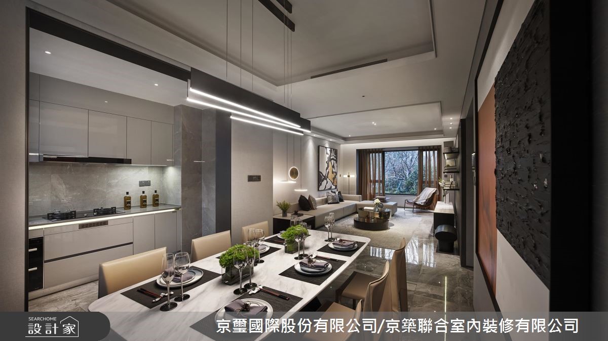 由簡約線性語彙作為起,刻意設定深色實木裝飾面材與帶有紋理進口壁布層次堆疊鋪排出內斂精緻的美感生活,並打破場域的限制隔閡,將大面窗景、客廳、餐廳置於同一空間軸線上,引入大量的自然光源提升空間氣度,汲取窗外的景色延伸視覺的想像,轉化成更開闊的生活領域。