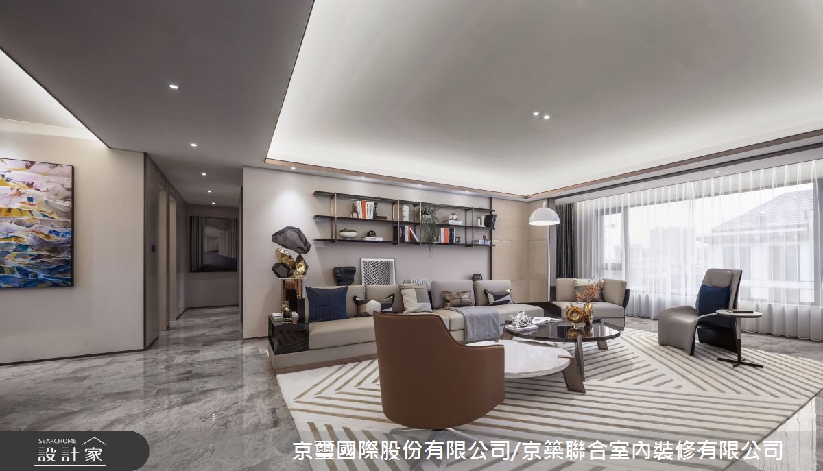 由京璽國際股份有限公司精心規劃的127坪四房住宅空間。因應屋主需求,設計師運用現代風作為主軸,搭配壁紙、木地板、鍍鈦金屬、石材、石紋地磚、淺色木皮、布,打造全家人的夢想家居。