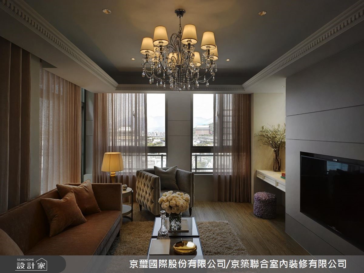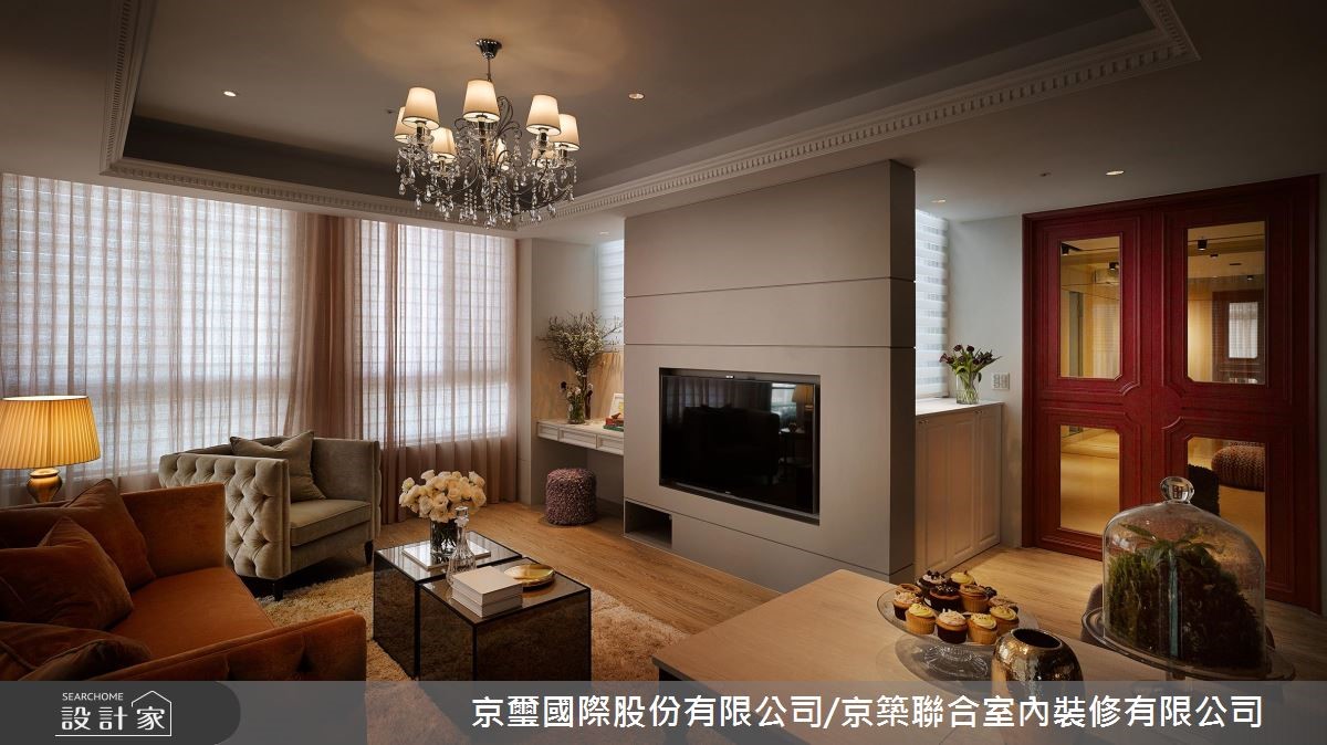 走進 30 坪空間,迎面而來暈黃溫潤的色調,佐定製傢俱、進口布幔、大理石、實木地板及水晶主燈,圍塑宛如電影場景般的奢華風韻,即使空間不大,卻透過精準的格局分配技巧,給予屋主尊榮感十足的生活感受;公領域優雅天花板、櫃體簡約線板帶出古典現代風主軸,再運用紅色系沙發軟件呼應紅色門框,創造屬於這間老屋獨有的特色;格局分配上,以開放的客、餐廳,完美發揮空間坪效;另外一區獨立空間,為鏡面練舞室,滿足屋主使用需求,也可轉換為多功能休憩區;深色鋪陳的主臥,以高床頭板搭配對稱床頭燈,加乘臥房放鬆度並呼應整體風格,傳遞復古奢華氣息。