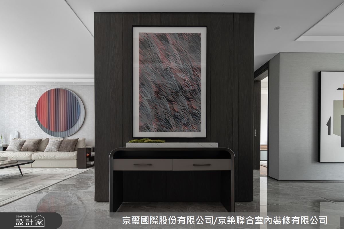 由京璽國際股份有限公司精心規劃的42坪五房住宅空間。因應屋主需求,設計師運用現代風作為主軸,搭配壁紙、木地板、鍍鈦金屬、天然大理石、石材、石紋地磚、布,打造全家人的夢想家居。