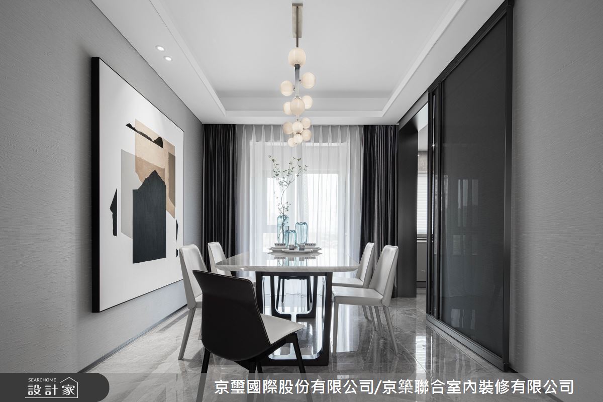 位於北京的 21.2 坪現代風空間,以「款待」為設計主軸,跳脫傳統框架打造開放且單純的生活型態,寬闊場域中匯聚了宴客廳、會客區、藝術廊道、收藏品展示區、個人私屬領域等充實機能,彼此獨立卻相互串連,開敞了生活尺度,卻拉近彼此距離。 整室柔和優雅的韻味,由淺灰主色的基底、大理石地坪、充沛日光鋪敘而成,並以簡練的裝潢襯托每件家具、裝飾物件,讓藝術美學悄然無聲地溜進生活空間。如圓弧大理石剖開的玄關屏風,亦或長桌後方別出心裁的背景裝飾,皆利用簡練卻獨特的設計層次,傳遞不造作的生活品味;滿足生活需求的收納規劃,透過高雅木皮製作的開放式展示櫃、間接光影的配合,增添簡潔櫃體的高雅氣質,空間中的光氛設計也相互輝映,提升視覺層次,賦予唯美放鬆空間精緻氛圍。 小編的最愛 簡約沙發休憩區,以純白色流線造型沙發、圓形大地毯型塑獨立區域感;一旁精美的玫瑰金吊燈與精品展示櫃輝映成趣,創造時尚與愜意感並行的窗邊角落;而存在感十足的黑色單椅及小桌几隨心擺放,替生活空間挹注多元卻富含機能的巧思設計,成為閱覽、下午茶的別緻天地。