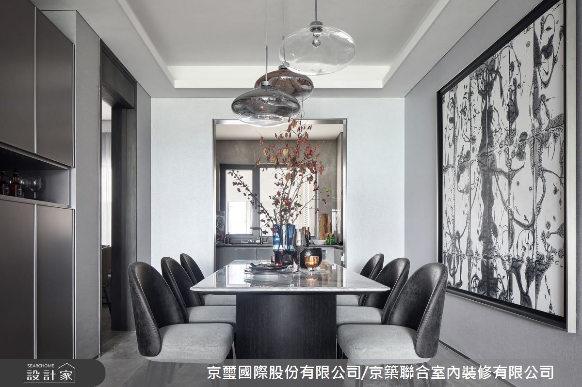 由簡約線性語彙作為起,刻意設定深色實木裝飾面材與帶有紋理進口壁布層次堆疊鋪排出內斂精緻的美感生活,並打破場域的限制隔閡,將大面窗景、客廳、餐廳置於同一空間軸線上,引入大量的自然光源提升空間氣度,汲取窗外的景色延伸視覺的想像,轉化成更開闊的生活領域。