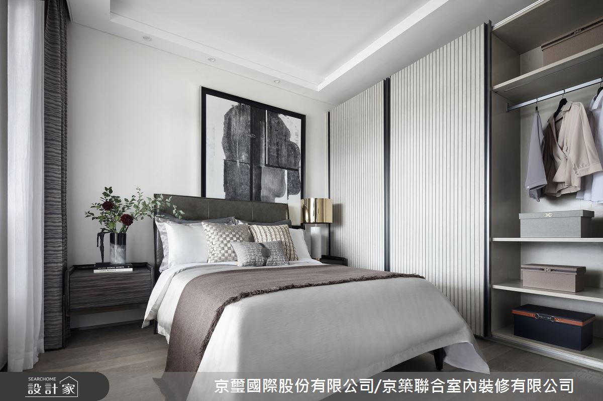 27.2 坪的現代宅突破傳統三房兩廳的格局疆界,透過石材、木質、金屬及布料的堆砌與轉換,讓人一打開門就著迷於散發精品氣質的室內景緻,創造出宛如百坪大宅的高雅風範。 玄關利用白色石材牆面開啟室內風格,結合天花板一整面的鍍鈦金屬,巧妙延伸空間的長軸,同時也自然劃分出左右兩側的居家動線。設計師將客餐廳與廚房收整在一起,打造開闊無所限制的公共空間,且藉由牆面石材、木質格柵的材質與間距變化,以及地坪肌理的改變,來營造各區域獨特又共通的藝術感受。 客廳電視檯面與多功能桌的交疊融合,滿足了親友聚會時的不同需求,而細膩切割的電視石材矮牆後方,則設置金屬和玻璃結合的展示櫃,讓視線可以穿梭於客廳及主臥之間,達到空間延展的審美效果。主臥承襲公領域的線條秩序,於窗邊規劃質感臥榻,提升整體的愜意氛圍;更衣室則設立兩扇門,使空間可以依據使用習慣,被定義為玄關衣帽間或主臥更衣室。 小編的最愛 客浴採用石材、鏡面與玻璃等異建材,俐落切割和拼湊出藝術感十足的拉門與屏風,體現設計師對於工藝細節近乎苛求的專注,完整契合居住者的生活品味。孝親房趨於沉穩,以床頭背牆的材質混搭和泡棉厚度,提升空間的溫馨感。小孩房選擇活潑明朗的黃色系,隨著歲月流逝,伴隨孩子一同成長,也不嫌稚氣天真。