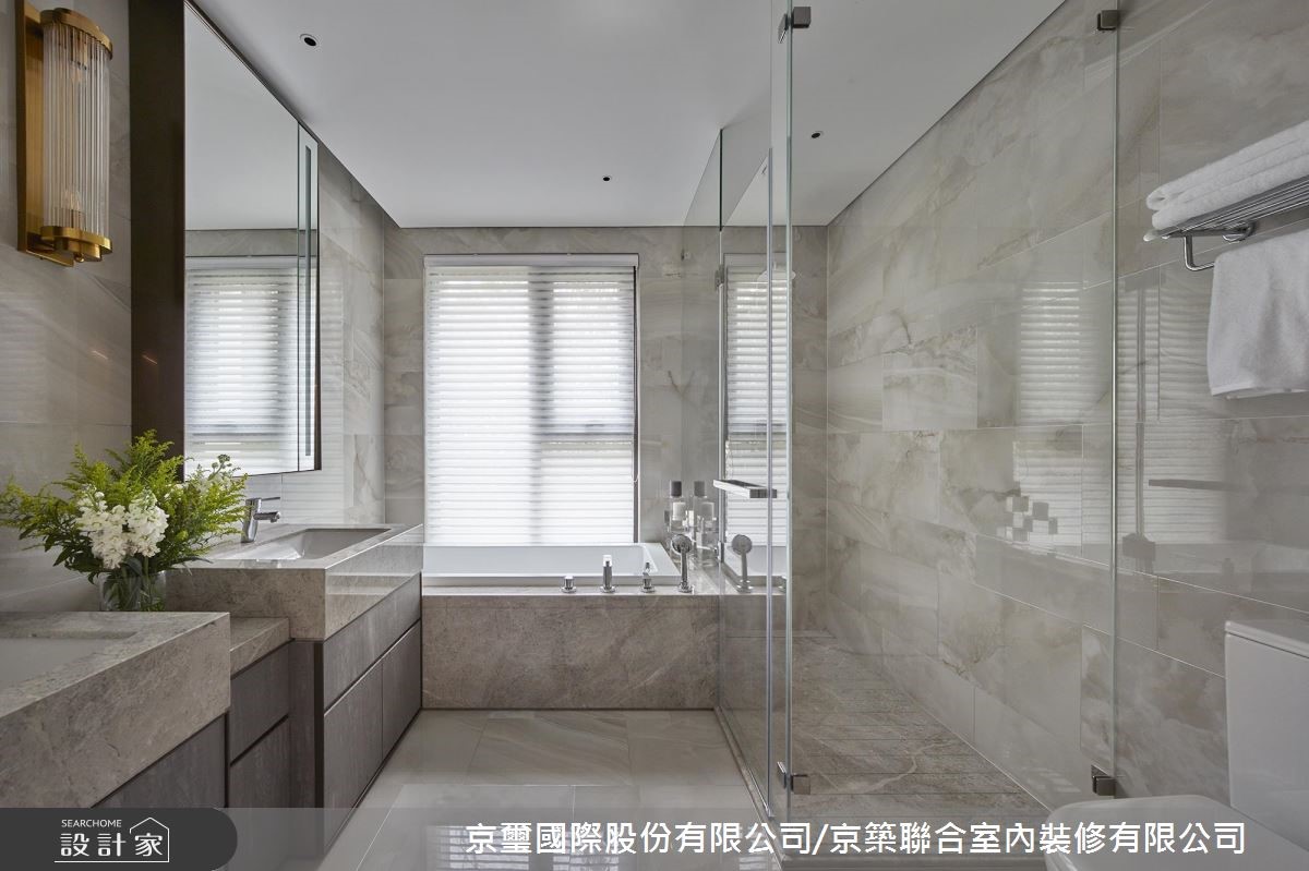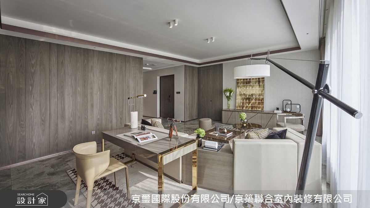 62.3 坪的現代風大宅,以大地色系與金屬元素為視覺主軸,配合簡約內斂的木皮紋路與石材肌理,取得適宜一家人生活的溫度平衡,徘徊其中感受絢爛高雅的空間氣質。 玄關藉由不對稱的櫃體,搭配仿古鏡前的端景,暗示公領域的動線走向。望左映入眼前的是打破室內與室外界線的大面積開窗,與客廳窗外的自然綠意化成一幅立面的畫作,形成寬闊舒適的生活場域。沙發後方則規劃為開放式的書房,設計師配置了兩面展示櫃,加上中央的掛畫,替室內塑造出高尚的藝文氣息,映著日光更添別緻。 位於居家另一側的餐廳,同樣選擇帶金的造型吊燈、畫作與窗簾,連貫整體空間的色調,而廚房透過金屬玻璃拉門與餐廳相隔,期待一家人能在此穿梭互動,為盤中美食增添溫馨感。主臥延續公領域視覺,立面壁紙上簡約的線性分割搭配溫潤木地板,窗外自然灑落的陽光提供主臥室溫暖的空間氛圍,而衛浴在淺灰石材的襯托下,規劃雙洗手台及浴缸,打造入住飯店般的休憩生活。 小編的最愛 多功能房以長型淺色木紋書桌,結合擁有收納功能的窗邊臥榻,呈現完整明亮的人文場域,即便在裡面已耗上一個下午,都還感到意猶未盡。