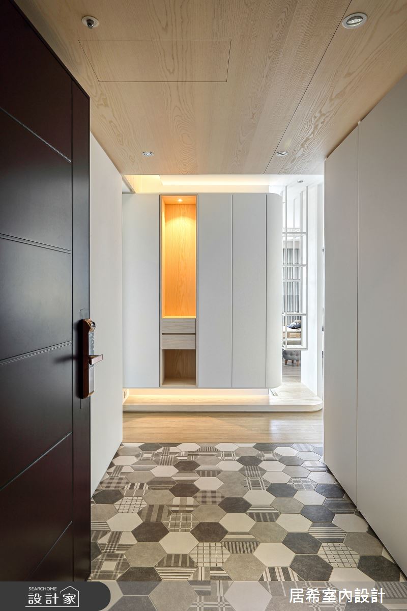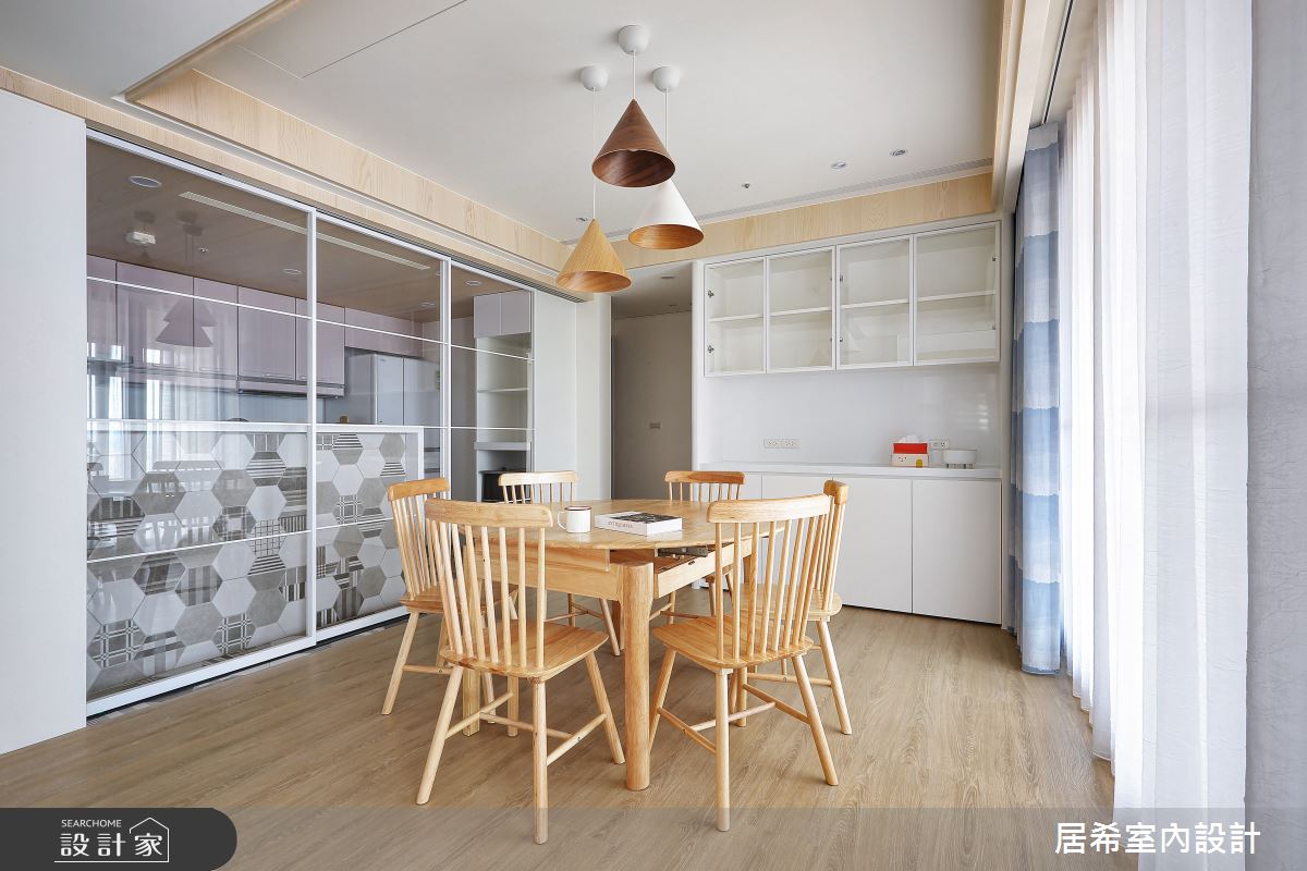 來自居希空間設計的40坪北歐風住宅案,屋主一家人共有2位大人、2位小孩,是一間單層新成屋(5年以下)的四房格局,設計師藉由建材以乳膠漆、六角磚/蜂巢磚、文化石、超耐磨木地板、鐵件、木作貼皮、烤漆、系統板材、木百葉、氟酸玻璃的搭配應用,實現一家人的理想生活。