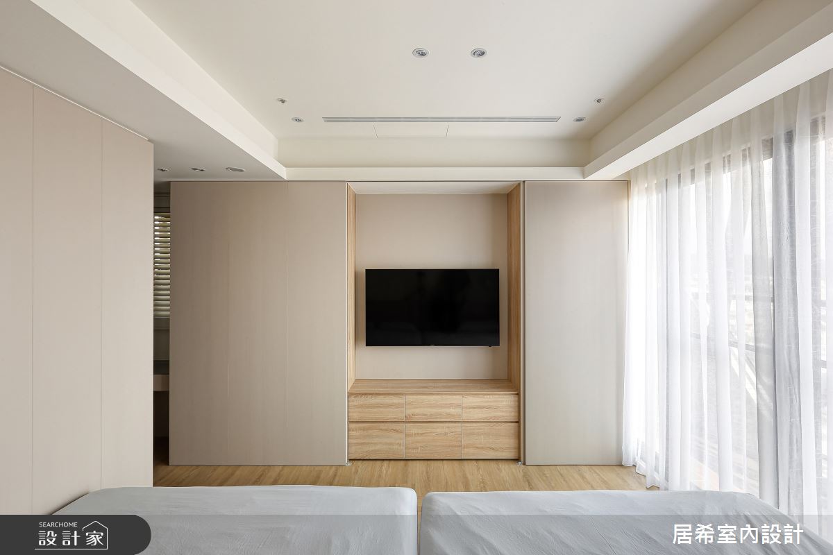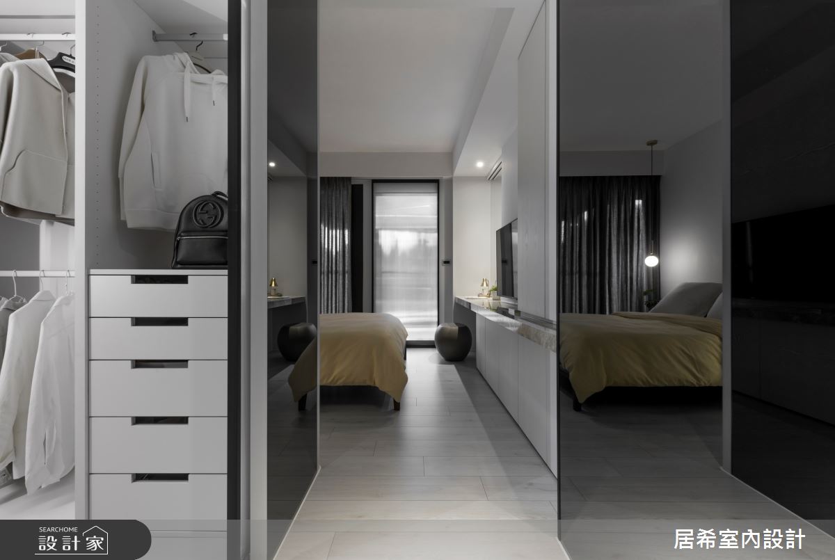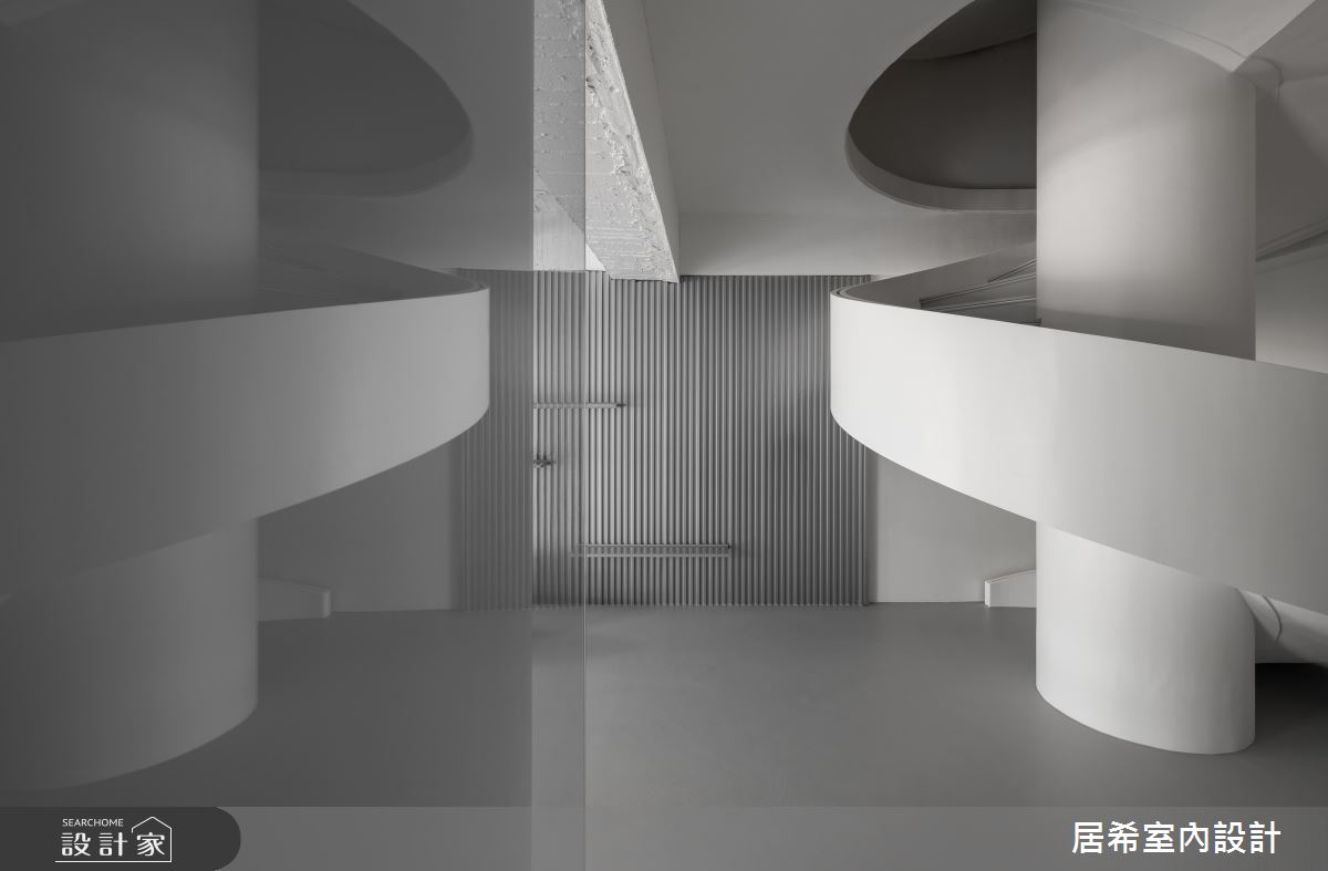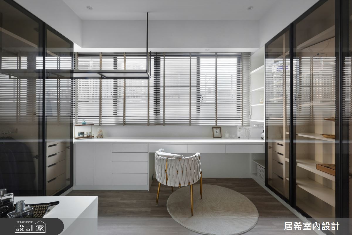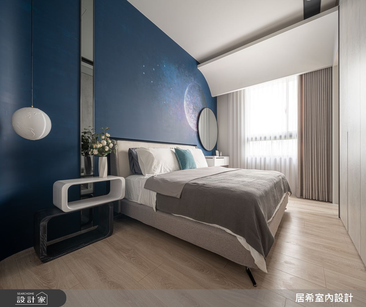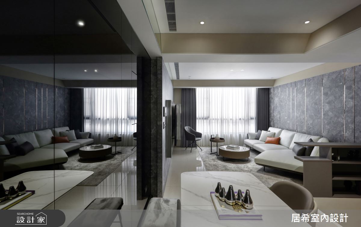 居希空間設計以乳膠漆、烤漆、繃布、金屬美耐板、系統板、黑鏡、明鏡、清玻、鋁框門、美耐板的搭配應用,呈現現代風居家氛圍,將此間36.9坪、五房、複層、新成屋(5年以下)打造成舒適愜意的家庭空間,完成3位大人全家人的夢想之居。