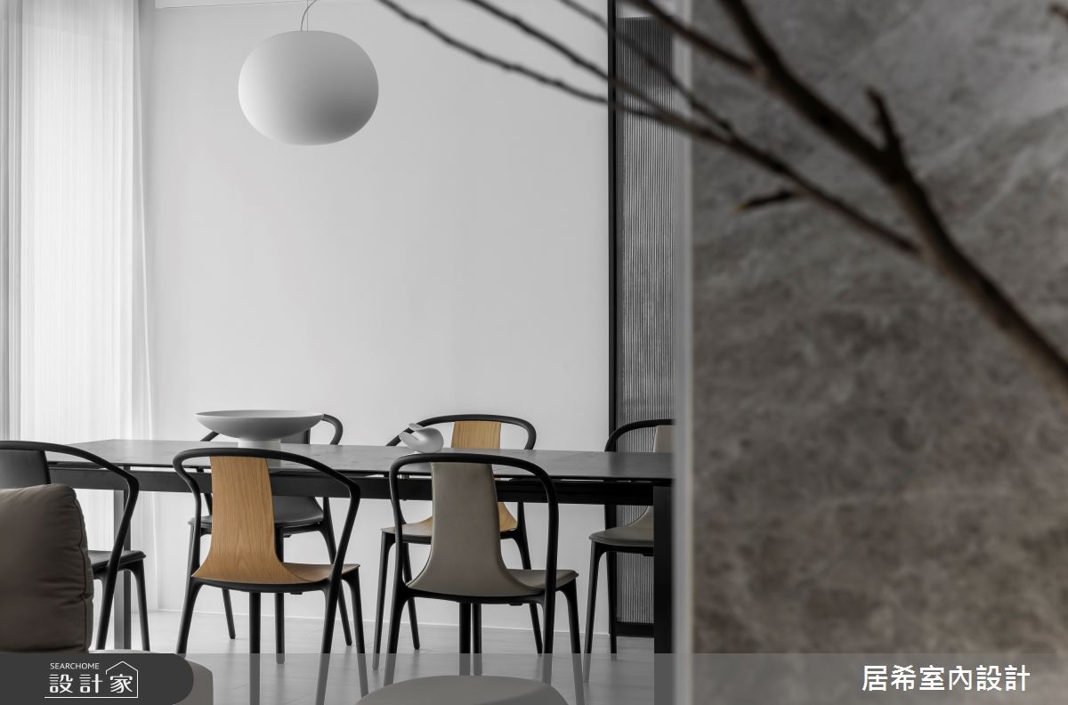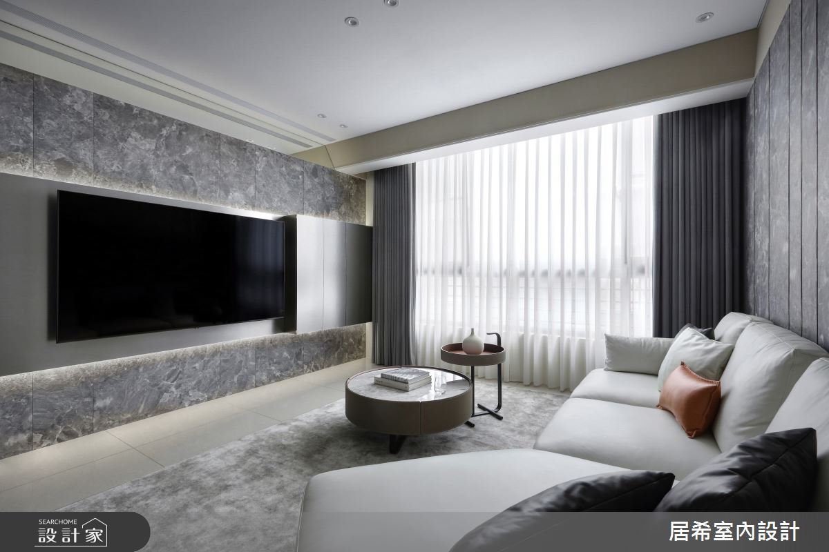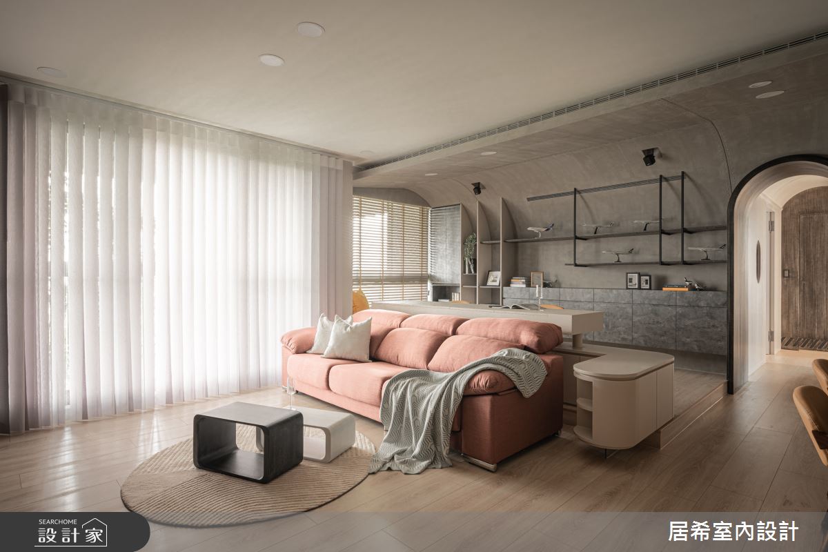 居希空間設計以乳膠漆、水泥漆、超耐磨木地板、鐵件、灰鏡、系統板材、石材的搭配應用,呈現現代風居家氛圍,將此間35坪、三房、單層、中古屋(5~15年)打造成舒適愜意的家庭空間,完成2位大人、1位小孩全家人的夢想之居。