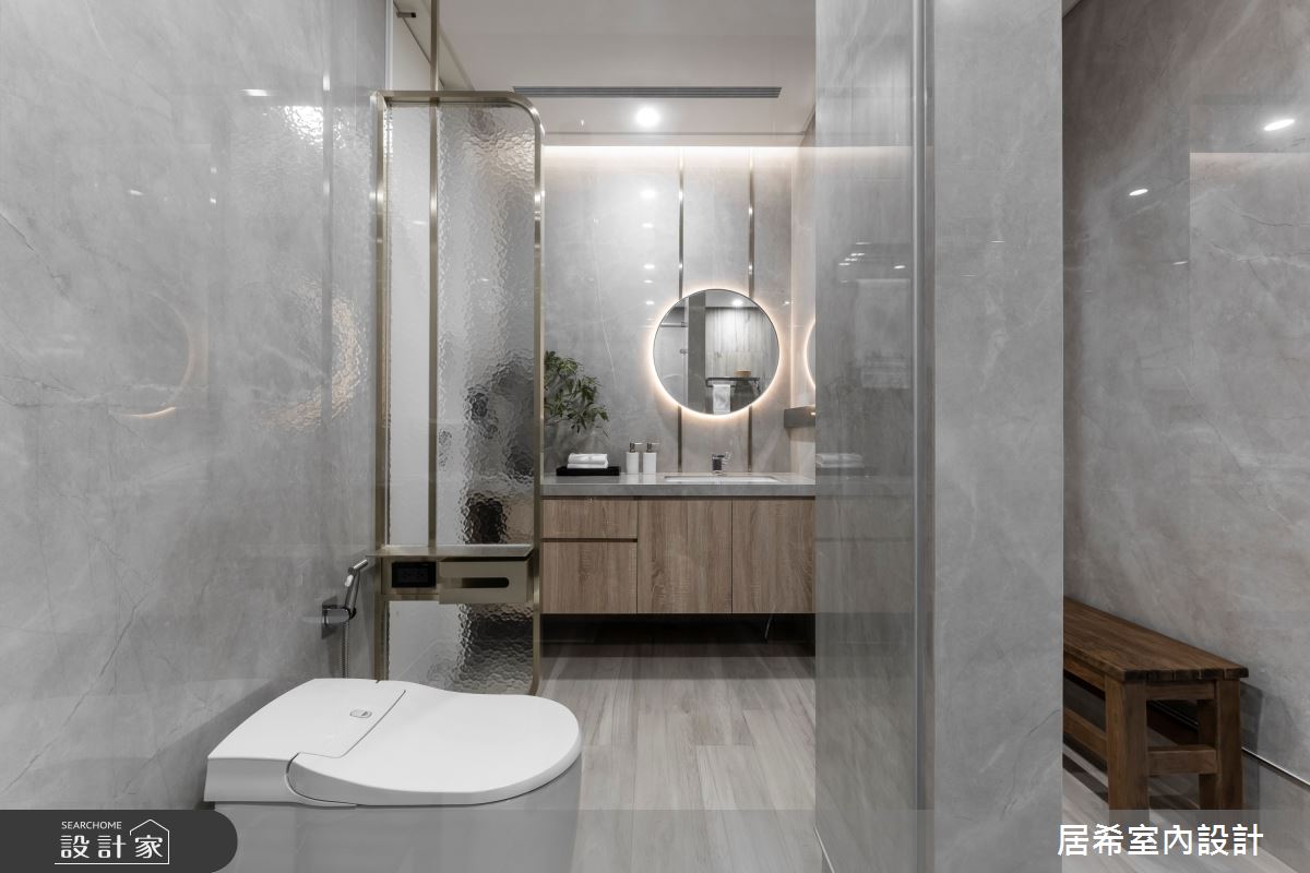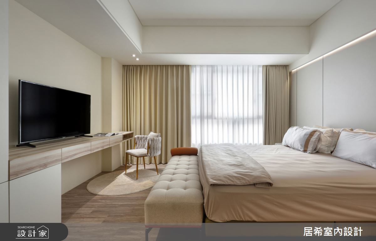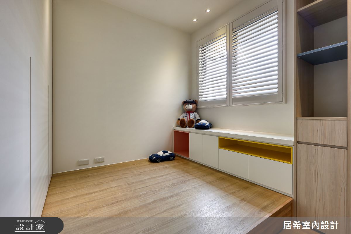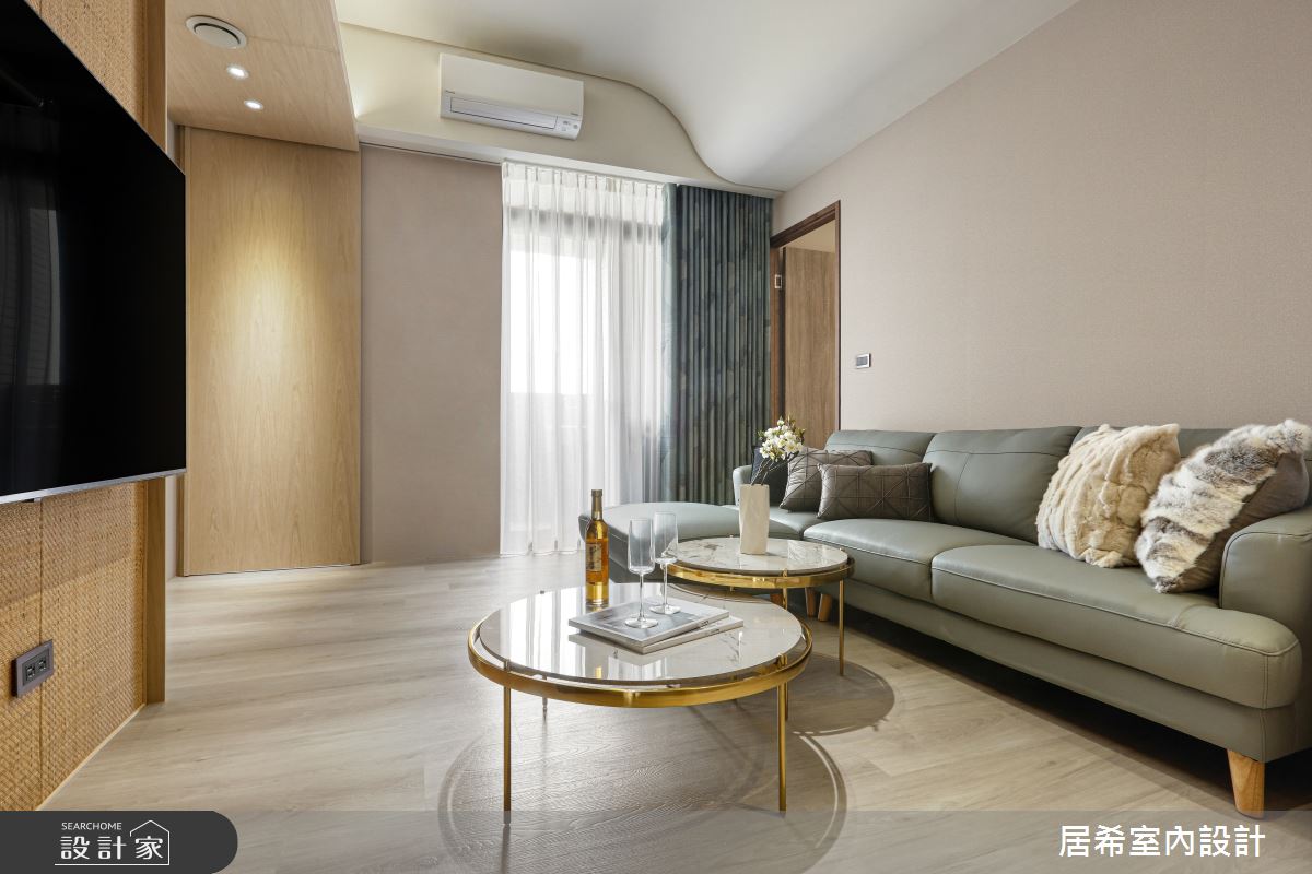 居希空間設計以乳膠漆、水泥漆、超耐磨木地板、鐵件、灰鏡、系統板材、石材的搭配應用,呈現現代風居家氛圍,將此間35坪、三房、單層、中古屋(5~15年)打造成舒適愜意的家庭空間,完成2位大人、1位小孩全家人的夢想之居。