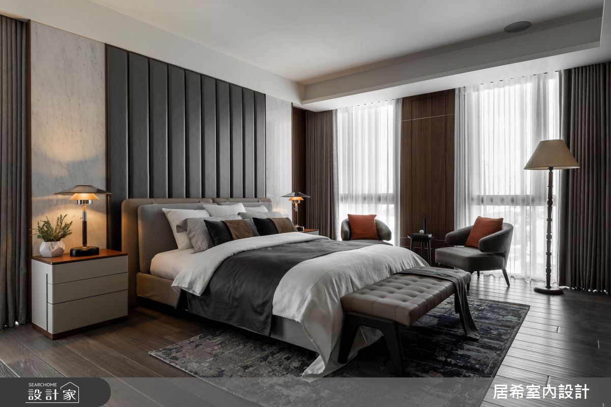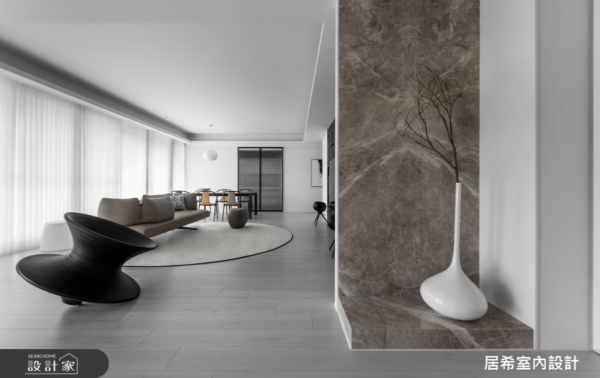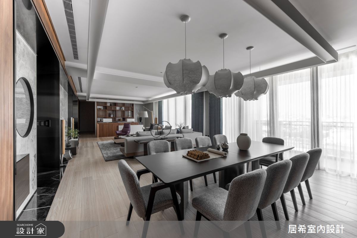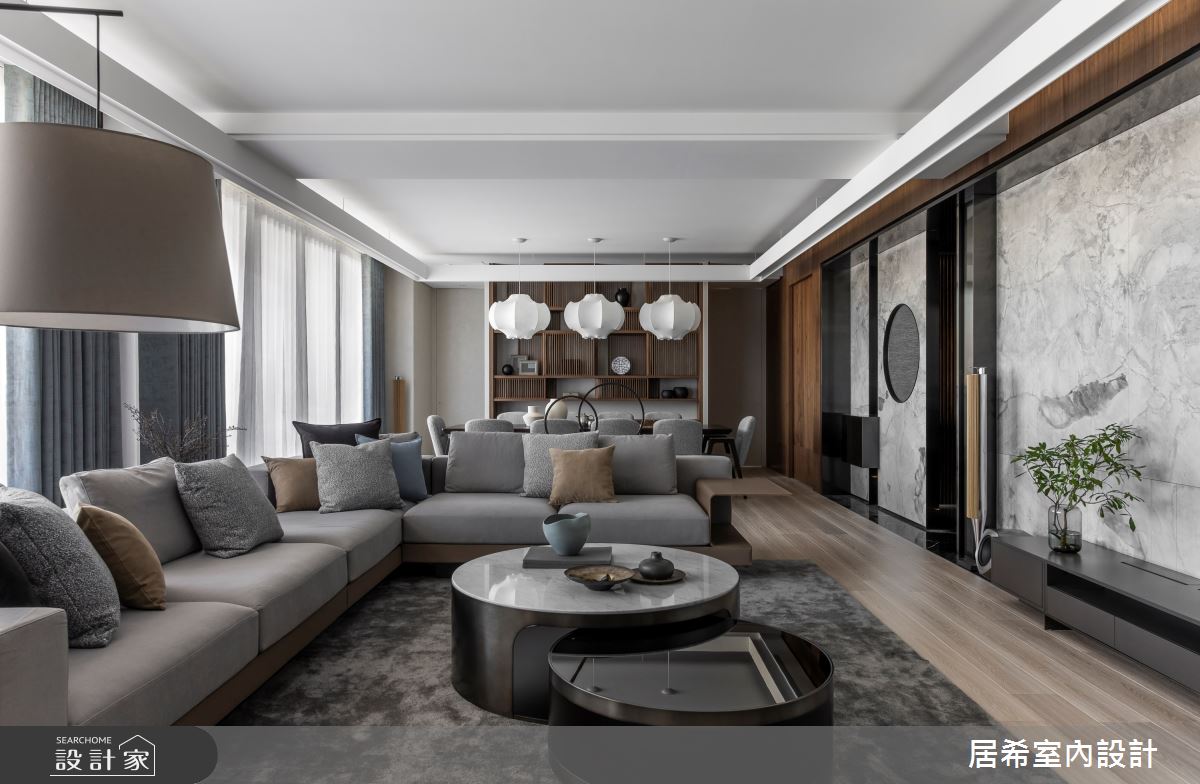 由居希空間設計精心規劃的100坪四房住宅空間,家庭成員一共有2位大人、2位小孩。因應屋主需求,設計師運用人文禪風作為主軸,搭配乳膠漆、六角磚/蜂巢磚、水泥漆、海島型木地板、鐵件、灰鏡、鍍鈦金屬、木作貼皮、烤漆、鋼刷木皮、系統板材、大理石、皮革、石材,打造全家人的夢想家居。