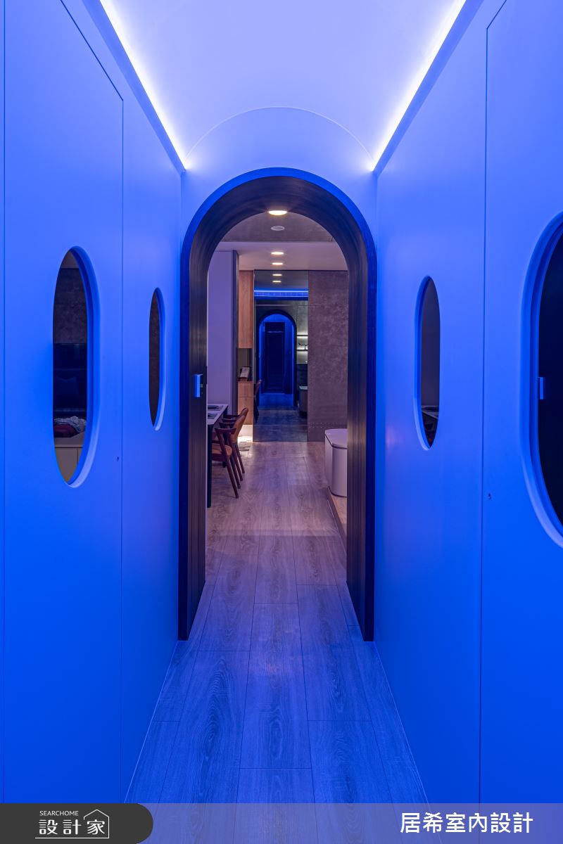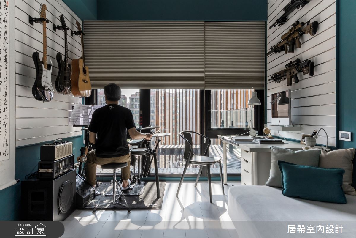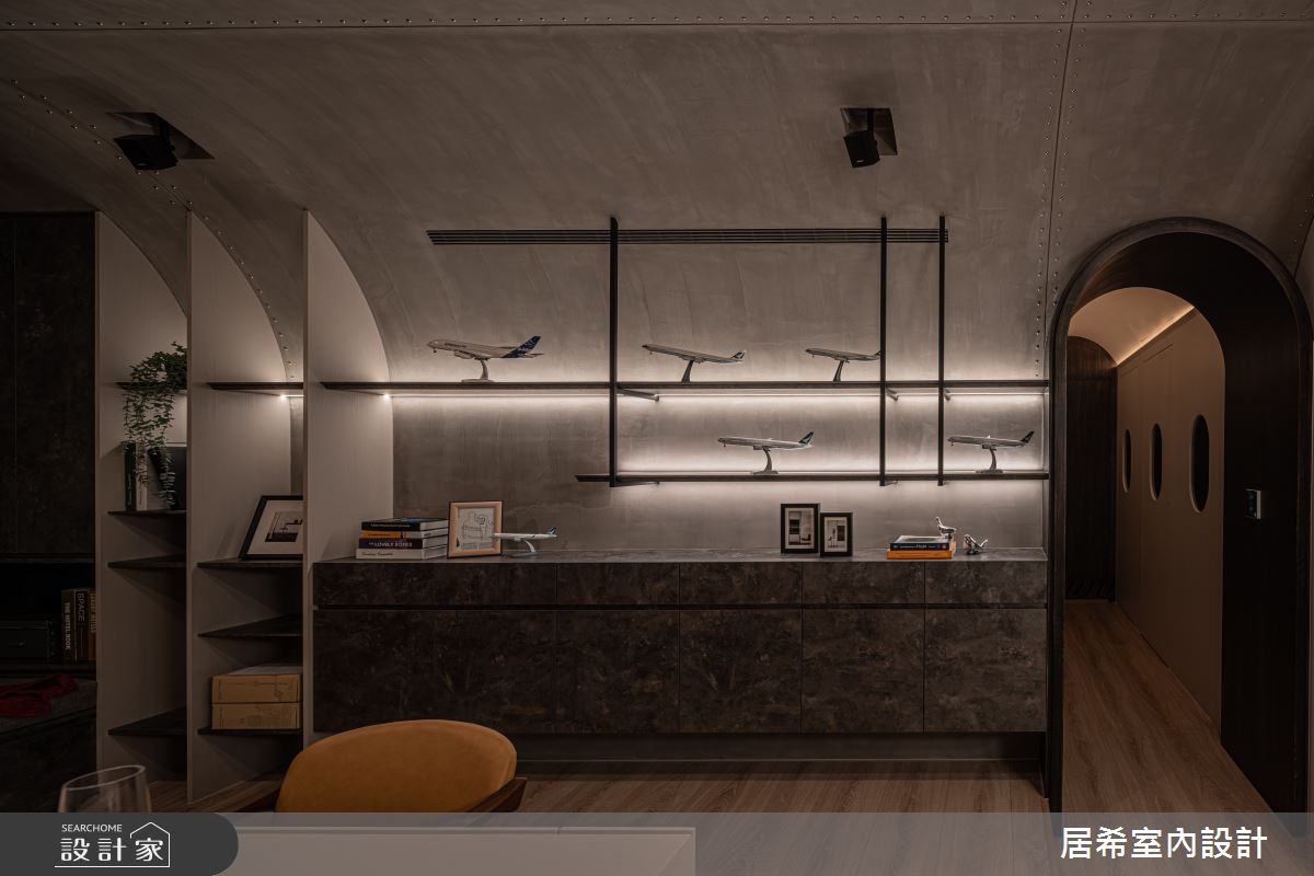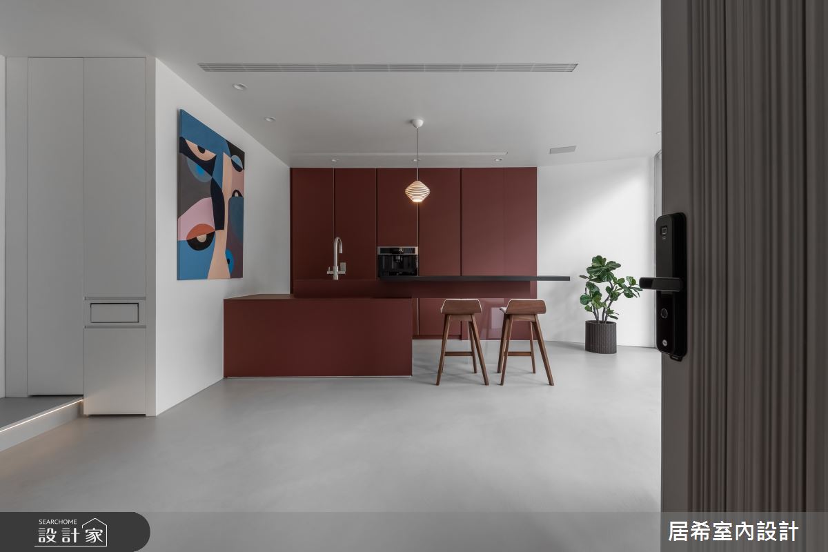 來自居希空間設計的35坪現代風住宅案,屋主一家人共有2位大人、2位小孩,是一間單層新成屋(5年以下)的三房格局,設計師藉由建材以壁紙、鐵件、灰鏡、烤漆、系統板材、特殊塗料、鉚釘、系統板、木皮的搭配應用,實現一家人的理想生活。