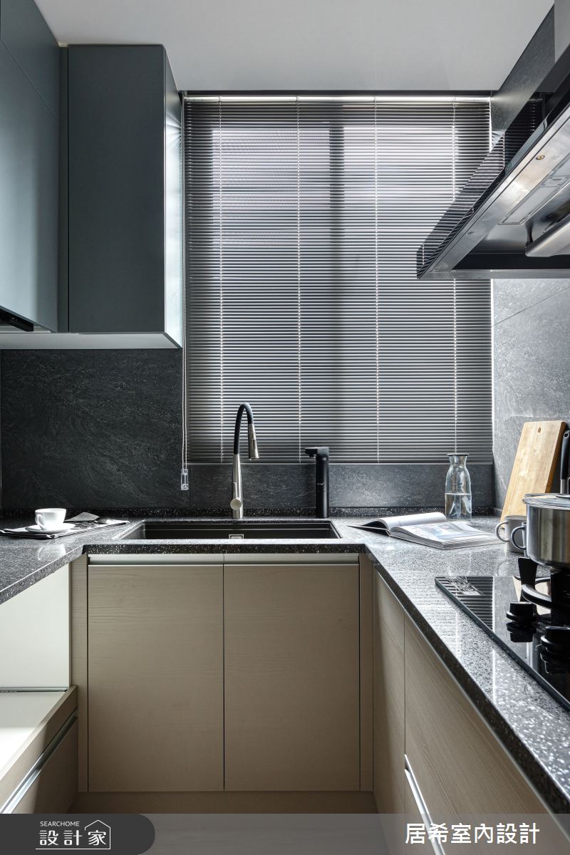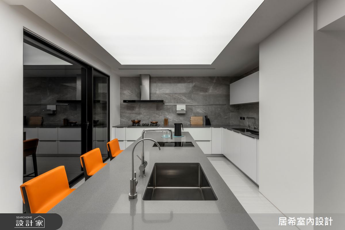 居希空間設計以乳膠漆、水泥漆、磁性漆/磁性黑板漆、超耐磨木地板、石英磚/拋光石英磚、鐵件、灰鏡、烤漆、系統板材、人造石的搭配應用,呈現現代風居家氛圍,將此間20坪、三房、單層、新成屋(5年以下)打造成舒適愜意的家庭空間,完成2位大人、3位小孩全家人的夢想之居。