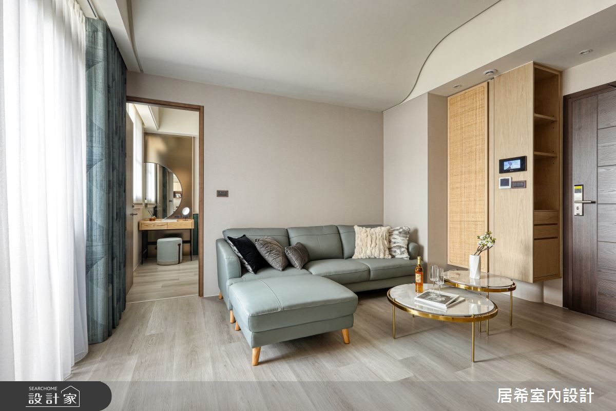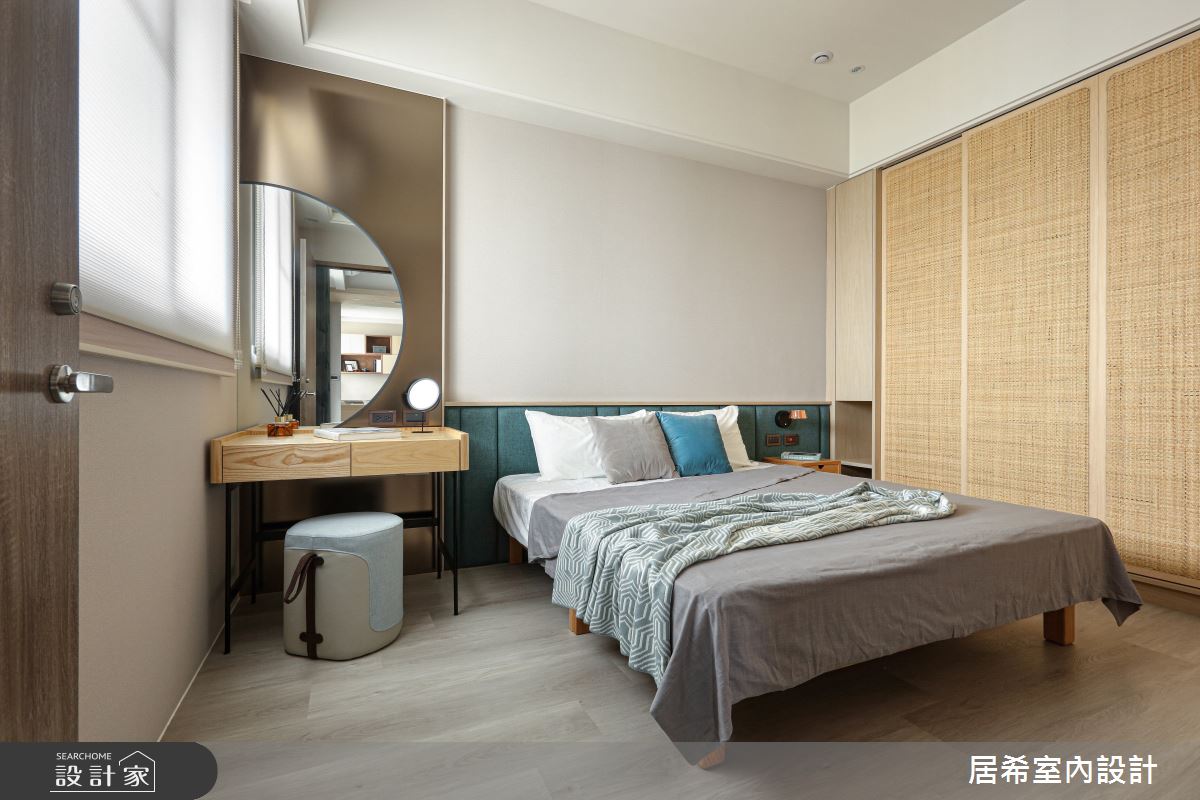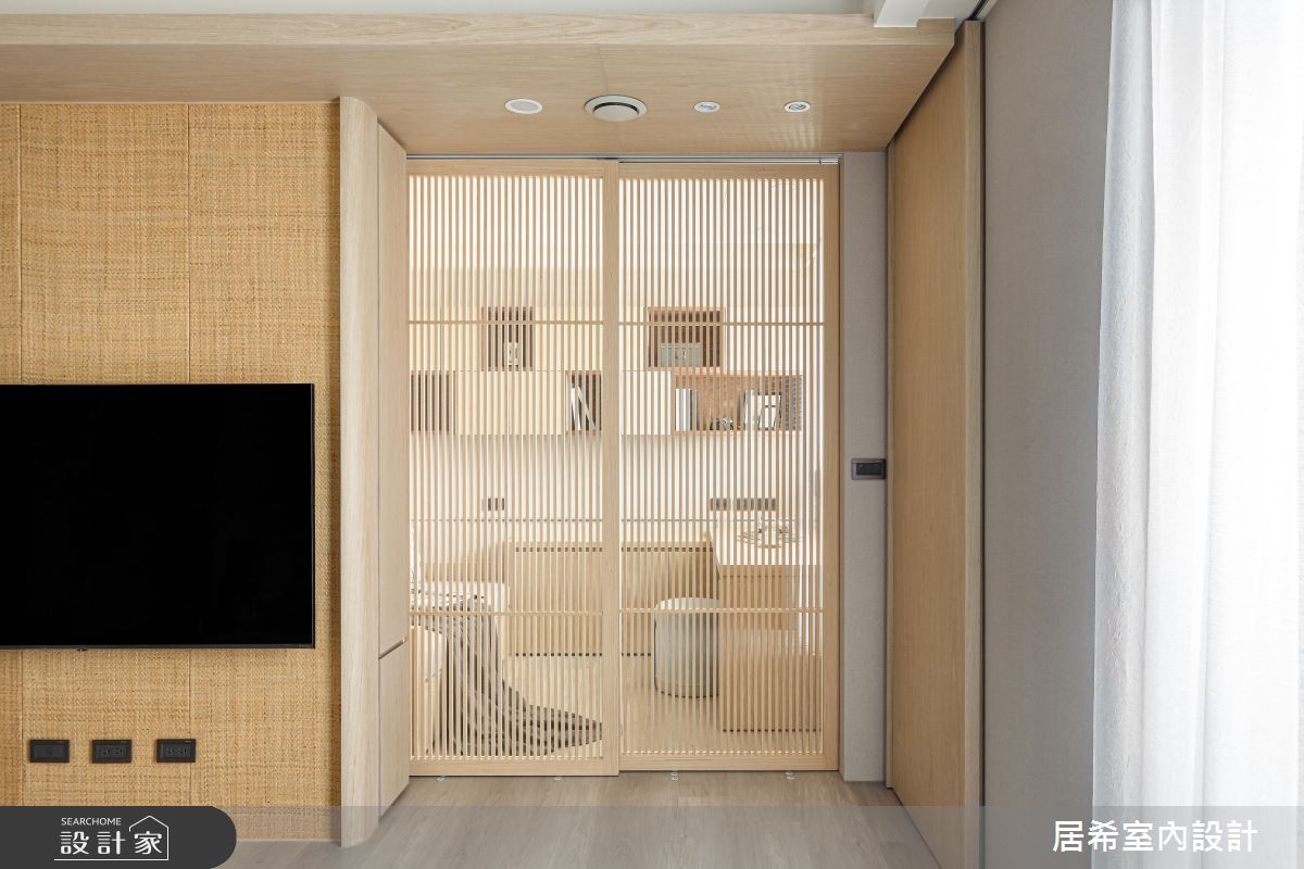 居希空間設計以繃布、木皮、實木格柵、石塑地板、氟酸玻璃、藤編、硅藻土、壁紙的搭配應用,呈現人文禪風居家氛圍,將此間12坪、兩房、單層、新成屋(5年以下)打造成舒適愜意的家庭空間,完成2位大人、1位小孩全家人的夢想之居。