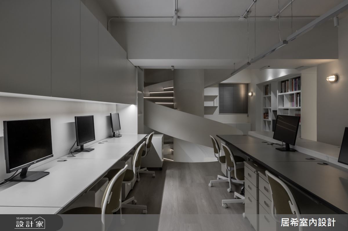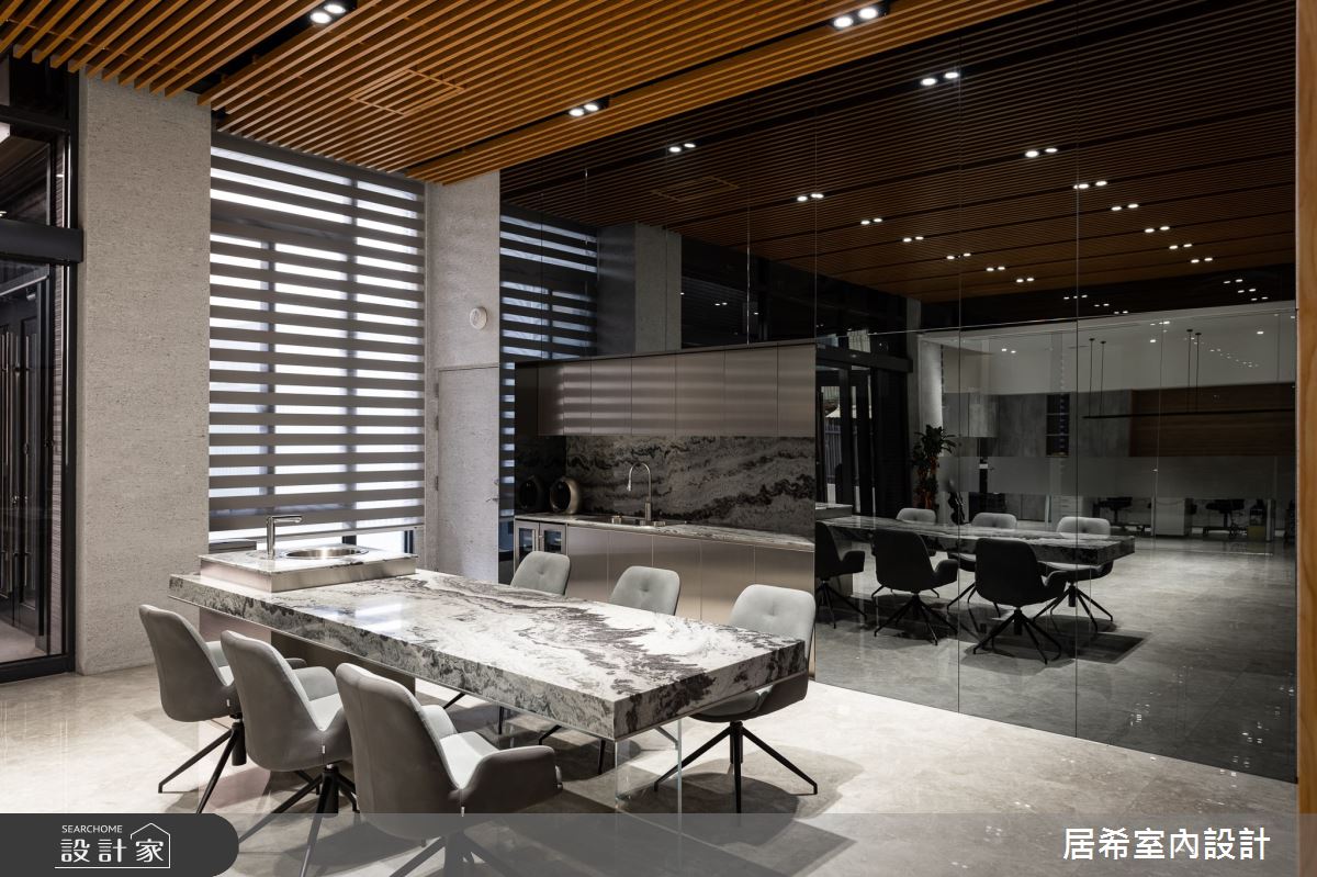 由居希空間設計精心規劃的100坪商業空間,因應業主需求,設計師運用簡約風作為主軸,搭配建材油漆、石英磚/拋光石英磚、盤多磨、不鏽鋼、鍍鈦金屬、系統板材、軌道燈、石材、水磨石,打造精緻品味的空間氛圍。