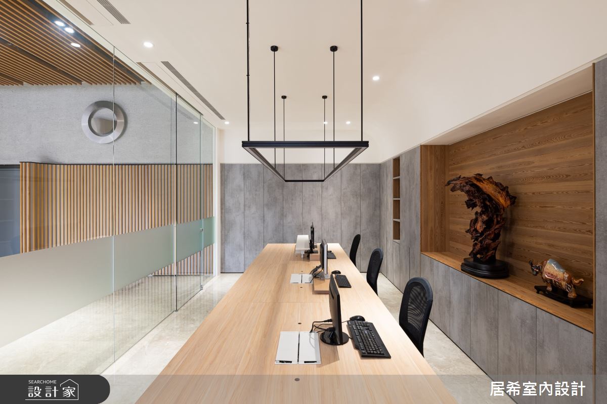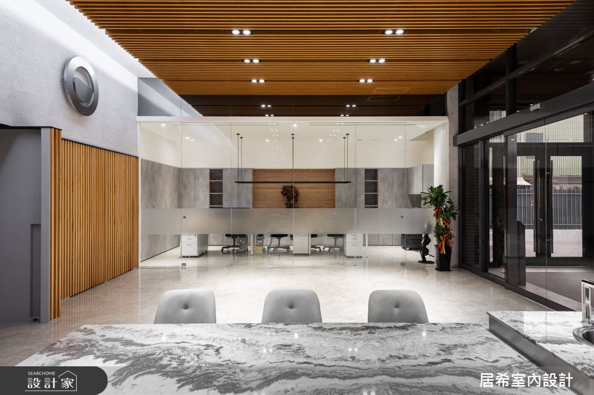 居希空間設計以油漆、石英磚/拋光石英磚、不鏽鋼、灰鏡、鍍鈦金屬、鋼刷木皮、系統板材、樂土、軌道燈、石材的搭配應用,呈現簡約風的風格氣息,將此間80坪新成屋(5年以下)優雅詮釋成舒適愜意的商業空間。
