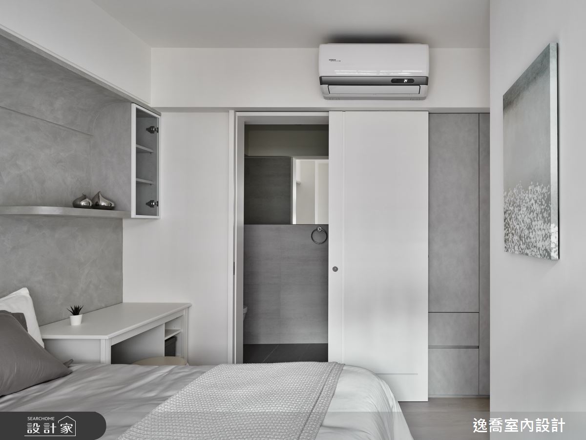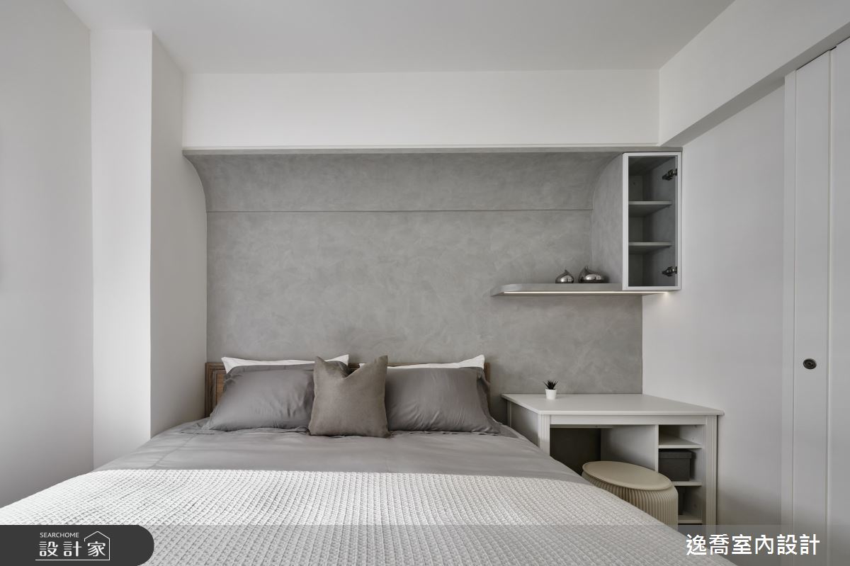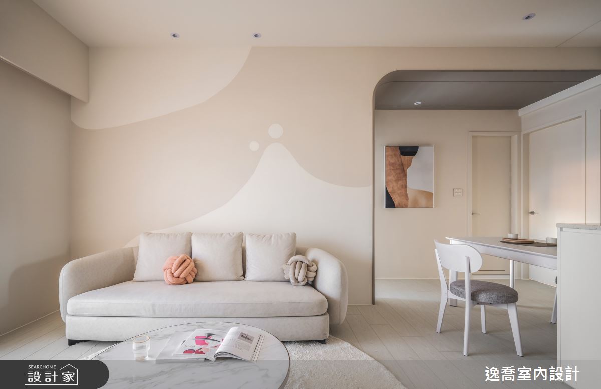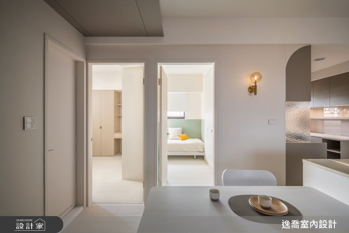 逸喬室內設計以乳膠漆、超耐磨木地板、烤玻、系統板材、人造石、噴漆、小冰柱玻璃、特殊塗料的搭配應用,呈現現代風居家氛圍,將此間8.5坪、一房、單層、老屋(16~30年)打造成舒適愜意的家庭空間,完成2位大人全家人的夢想之居。