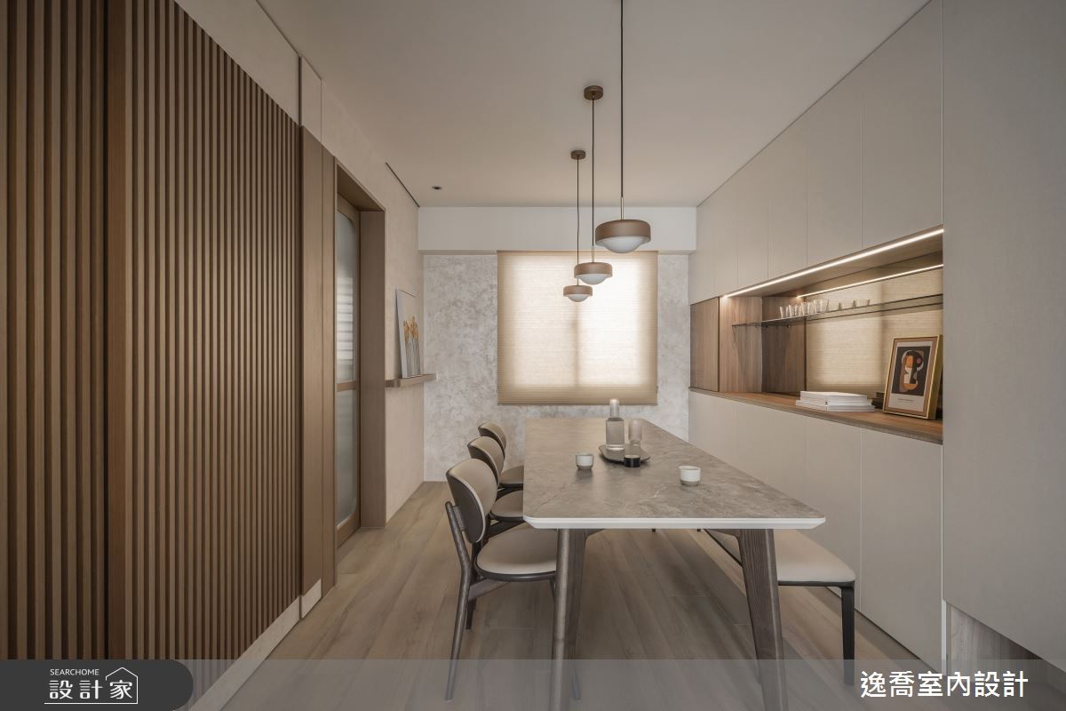 逸喬室內設計以乳膠漆、木紋磚、石英磚、鍍鈦金屬、磁磚、賽麗石、美耐板、特殊塗料、超白玻璃、壓克力的搭配應用,呈現現代風居家氛圍,將此間36坪、兩房、單層、老屋(31~40年)打造成舒適愜意的家庭空間,完成2位大人全家人的夢想之居。
