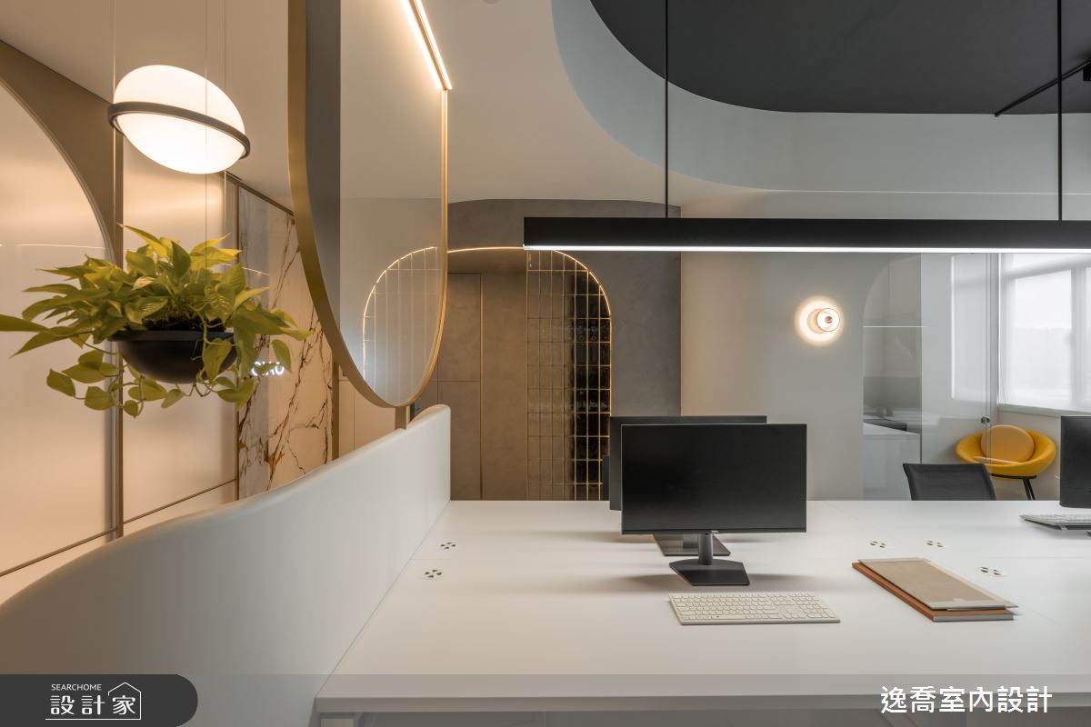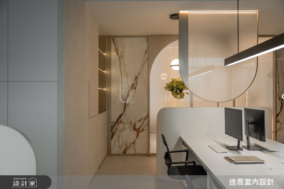 逸喬室內設計以乳膠漆、鐵道磚、石英磚/拋光石英磚、鐵件、系統板材、大理石、石塑地板、噴砂玻璃、超耐磨漆、特殊塗料的搭配應用,呈現現代風的風格氣息,將此間29坪老屋(16~30年)優雅詮釋成舒適愜意的商業空間。