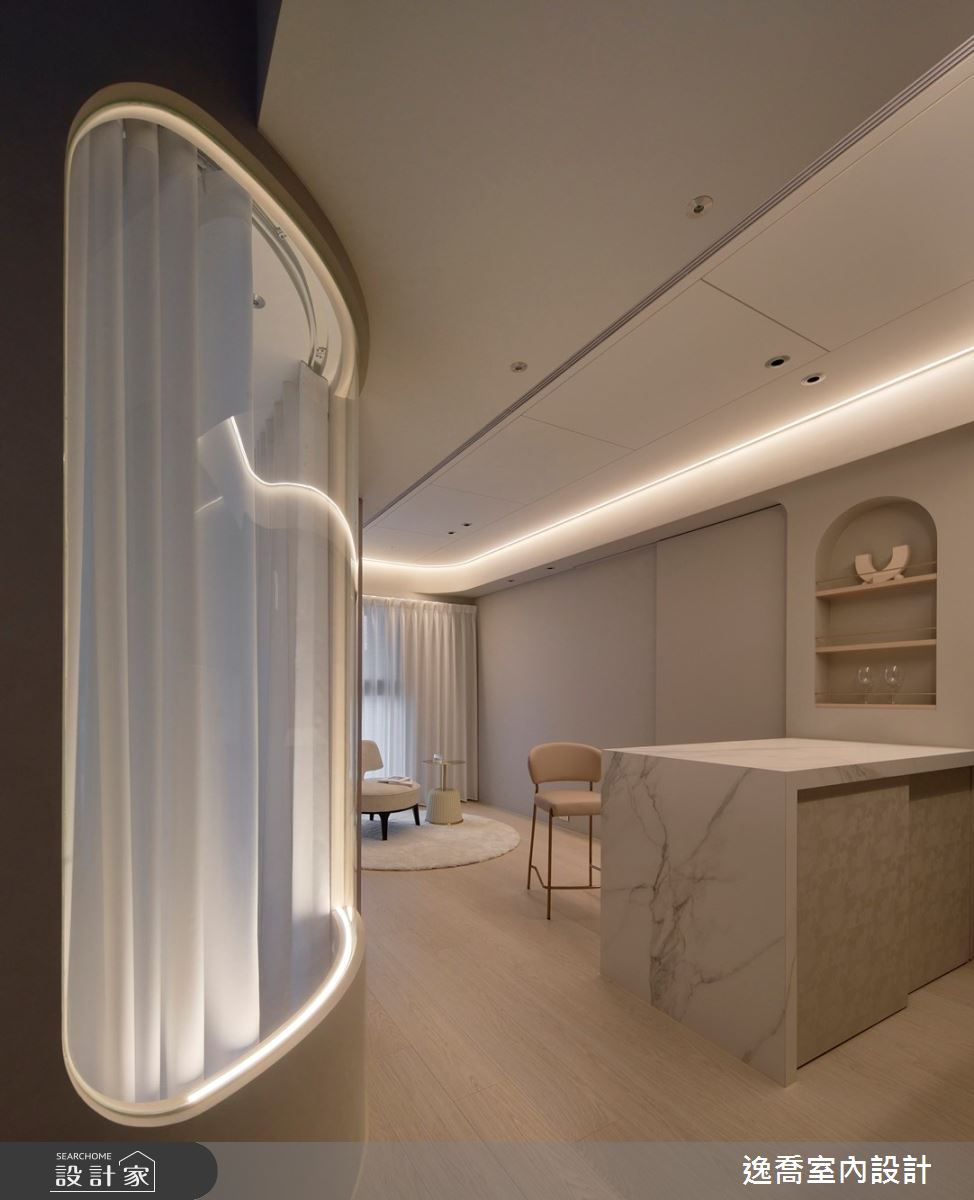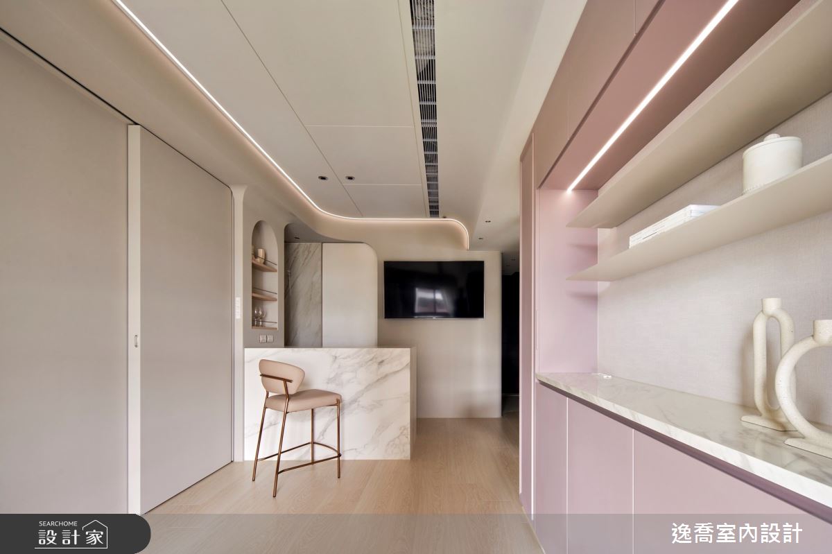 逸喬室內設計以乳膠漆、超耐磨木地板、烤玻、系統板材、人造石、噴漆、小冰柱玻璃、特殊塗料的搭配應用,呈現現代風居家氛圍,將此間8.5坪、一房、單層、老屋(16~30年)打造成舒適愜意的家庭空間,完成2位大人全家人的夢想之居。