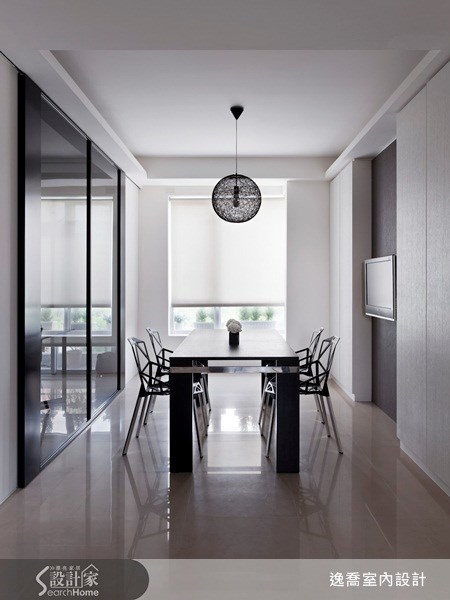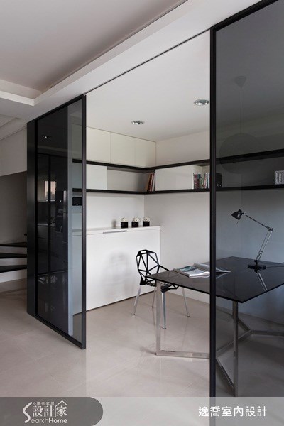 本案為70坪、3層樓的獨棟別墅,家庭成員有屋主夫妻與2個小孩。一樓玄關右側設計師以灰鏡作為鞋櫃門片,鏡面效果映射出加倍景深。玄關左側則為格柵隔屏,利用垂直線條區分內外。客廳的電視主牆以橡木染黑為主題,延續玄關鞋櫃設計手法,採懸浮式搭配間接光源。黑色的線條與白色壁面形成強烈的對比且視覺上延伸空間感。淨白的沙發背牆包覆掉原結構的柱體及電箱,並利用其深度作為收納。樓梯扶手設計以鐵件搭配玻璃,拉出線與面的極簡藝術造型。二樓公共空間以餐廳為核心,利用大面灰色玻璃拉門為介面,劃分廚房、書房與餐廳,形成各自獨立與密切互動的關係。主臥藉由中性色彩、浮雕橡木地板、窗紗等元素,帶來溫潤柔化效果。三樓更衣室分門別類的機能設計,猶如服飾店展示規格,收納性能強大且一目了然。主臥更衣室與浴室保留充足的自然採光,利用清玻璃區分空間,化妝檯及浴櫃一氣喝成的線條並運用石材、鏡面鋼烤延續黑白色系設計語彙,讓衛浴空間格外敞亮舒適。房屋格局:玄關、開放式廚房、餐廳、客廳、起居兼書房、四房兩衛、工作陽台。主要建材:噴砂橡木染色、鐵件烤漆、灰鏡、黑玻璃、烤漆玻璃、浮雕橡木地板、印度黑石材。
