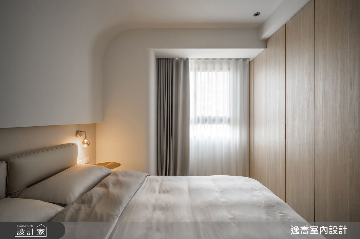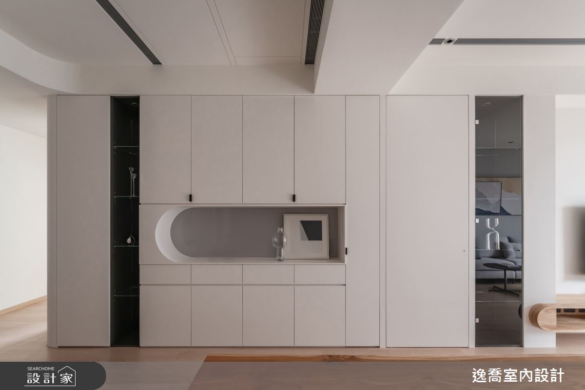 逸喬室內設計以乳膠漆、超耐磨木地板、烤玻、木作貼皮、系統板材、木百葉、木作貼美耐板的搭配應用,呈現現代風居家氛圍,將此間34坪、三房、單層、新成屋(5年以下)打造成舒適愜意的家庭空間,完成2位大人、1位小孩、1位長輩全家人的夢想之居。
