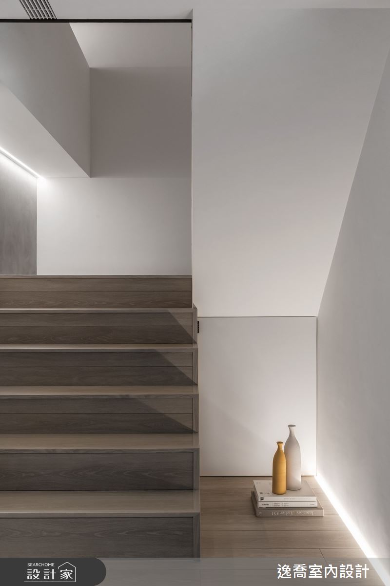 逸喬室內設計以乳膠漆、鐵件、灰鏡、木作貼皮、鋼刷木皮、系統板材、木百葉、人造石、石紋美耐板、石塑地板、仿水泥特殊漆的搭配應用,呈現現代風居家氛圍,將此間27坪、四房、樓中樓、新成屋(5年以下)打造成舒適愜意的家庭空間,完成2位大人、3位小孩全家人的夢想之居。