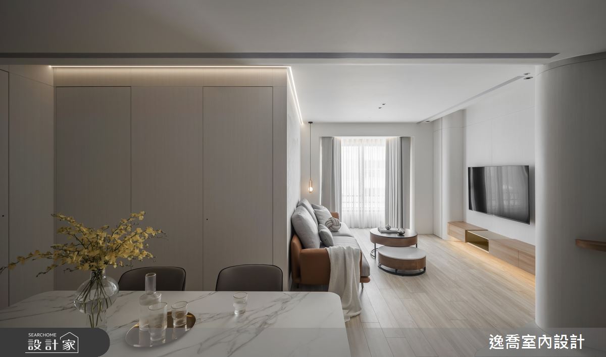 由逸喬室內設計精心規劃的18.5坪兩房住宅空間,家庭成員一共有2位大人。因應屋主需求,設計師運用現代風作為主軸,搭配乳膠漆、超耐磨木地板、鐵件、琥珀鏡、小冰柱玻璃、木作貼皮、系統板材、石材、繃布、線板、噴漆,打造全家人的夢想家居。