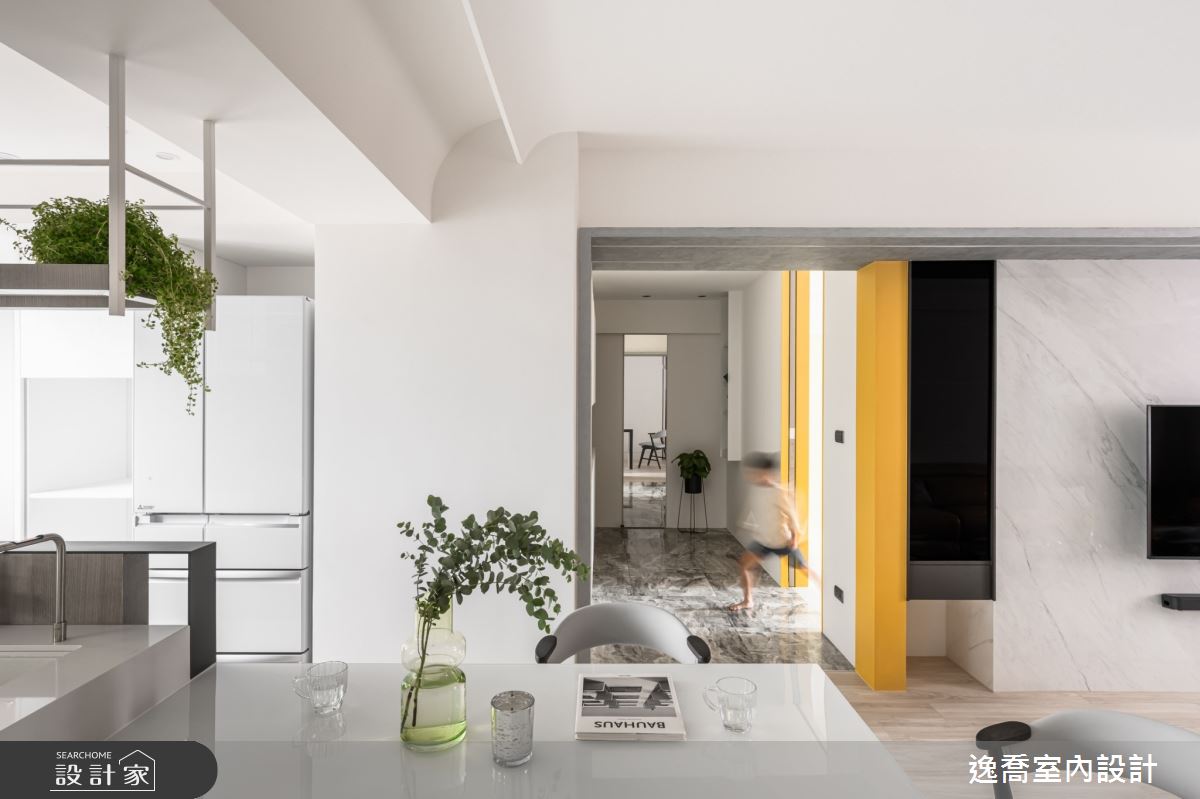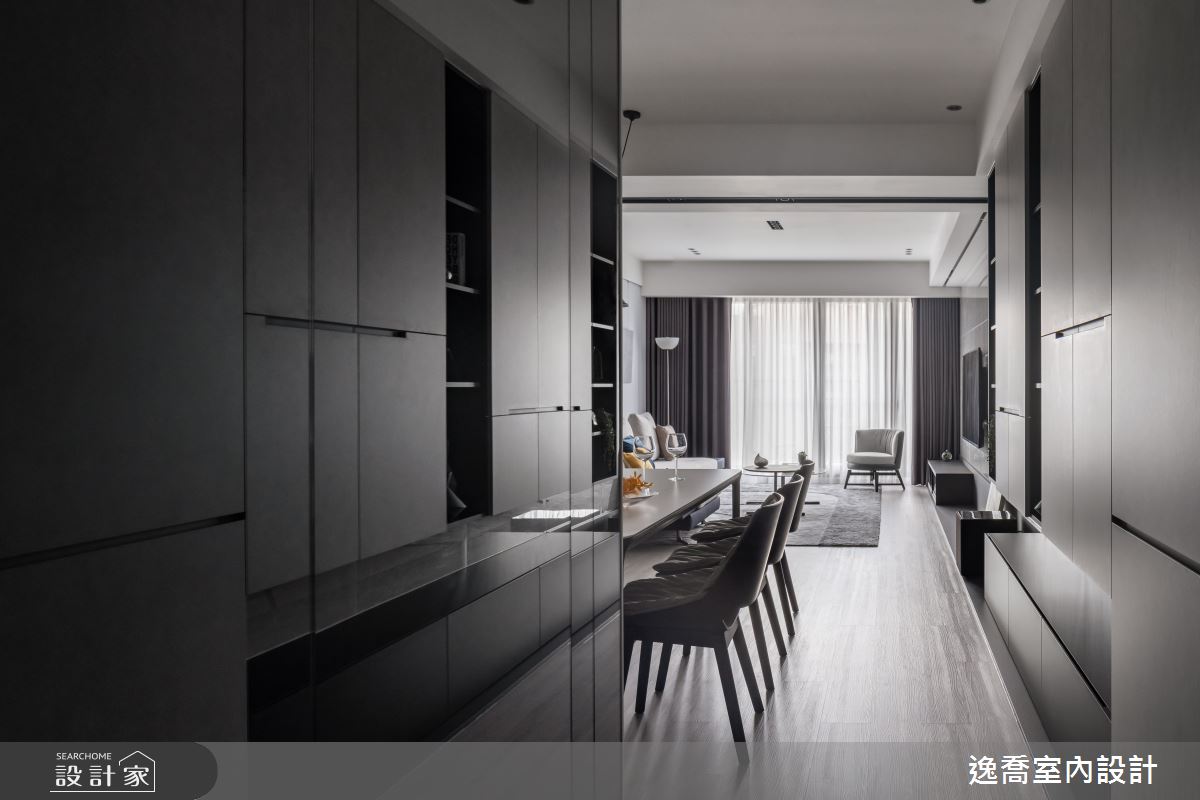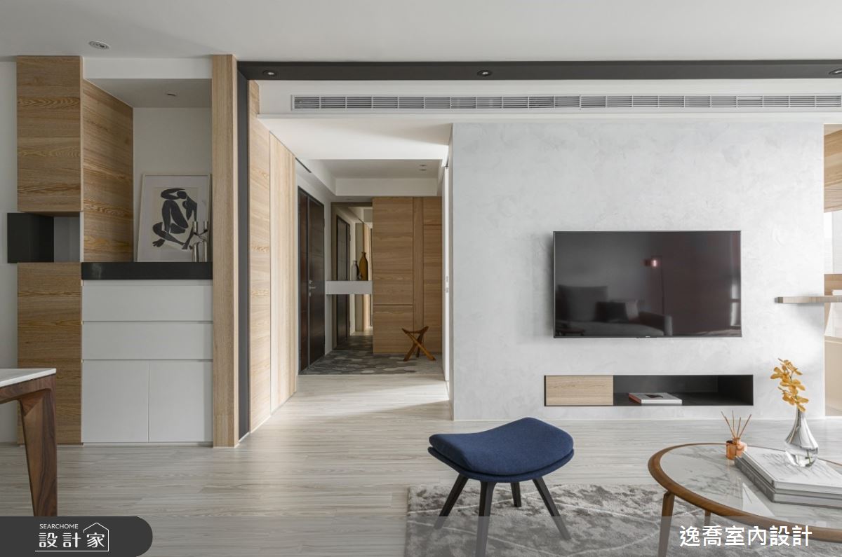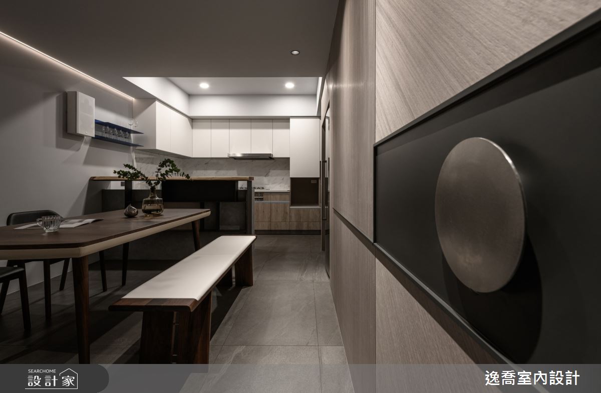 來自逸喬室內設計的35坪現代風住宅案,屋主一家人共有1位大人,是一間單層新成屋(5年以下)的三房格局,設計師藉由建材以乳膠漆、石英磚/拋光石英磚、不鏽鋼、鐵件、灰鏡、木作貼皮、木百葉、繃布、噴漆、石塑地板的搭配應用,實現一家人的理想生活。