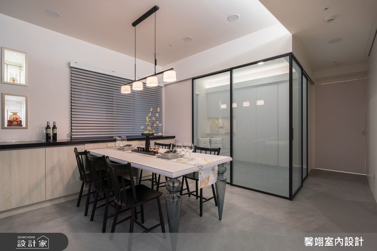 馨翊室內裝修設計以超耐磨木地板、鐵件、系統板材、磁磚、賽麗石、班傑明油漆、玻璃磚、連動鋁框拉門的搭配應用,呈現現代風的風格氣息,將此間25坪老屋(31~40年)優雅詮釋成舒適愜意的商業空間。