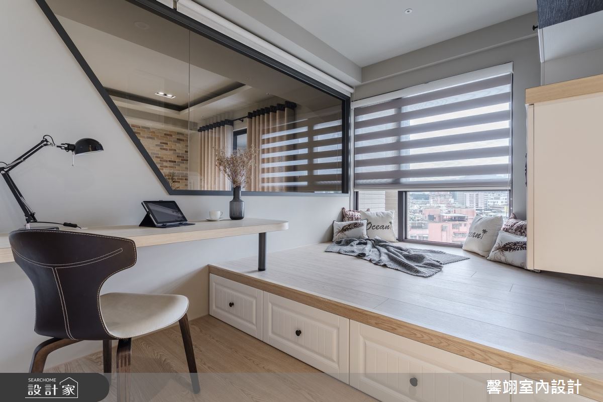 29坪的整體空間裡,以女屋主喜愛的鄉村風做為風格基調,且融入現代乾淨、簡約的線條,並透過大量的白色調飾底,以藕色、灰色與木紋色調局部妝點,創造出漸層、素雅的輕鄉村風尚私宅。 入口玄關的設計上,為了避免一眼直接看到客廳與餐廳,兩側藉由低矮的櫃體擺設,半開放的飾視線讓空間更顯寬敞、流動,同時滿足收納機能的實用生活。延伸玄關櫃體的收納設計,一直來到電視牆,不同顏色的文化石鋪設出溫潤質感的電視牆,隨著嵌燈照明的映照,輕灑出家的溫馨質感;沙發背牆上半部以玻璃隔間,圍塑出後方的書房區,落地窗引入充沛光線,灑落在木紋肌理鋪陳的地板上,與白色線板描繪出收納櫃造型,創造出清爽質感,架高的床鋪可做為休憩之用,十分愜意,而床的側邊加裝抽屜,高度擴充實用的收納機能。開放的餐廳空間裡,挑選原木質感的餐桌,替用餐領域增添溫馨與自然質感;面向書房空間的壁面以層櫃安排,讓屋主的珍藏品可做為陳列藝術之用,不等距的層櫃設計,替家增添些許活潑氣息。 小編的最愛 主臥空間裡,特別增加一個更衣室,讓機能更為完整;而兩間男孩房以藍色調為專屬色系,床皆使用無床架,以架高懸浮的方式呈現,讓空間展現出輕盈無壓之感。