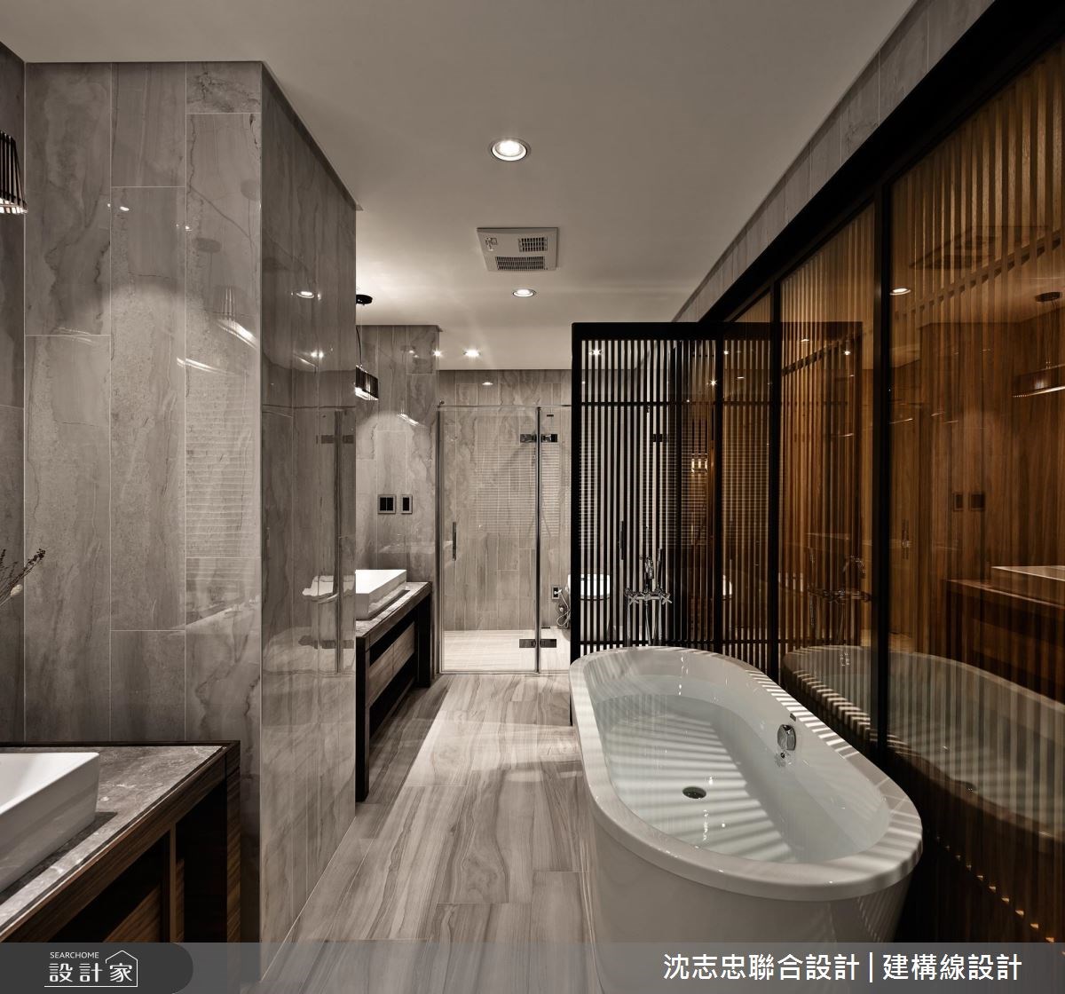 百坪混搭風大宅靈活運用異質材拼搭,讓深色木質與大理石材一熱一冷交會碰撞,激盪出內斂沉穩與奢華大器兼具的獨特氣息。 簡潔俐落的玄關區,藉由鏡子延展放大效果,奠定迎賓入口開闊印象,多人進出門時,能共用大面明鏡,快速方便地一起整理儀容;由格柵設計的電視櫃牆劃出了落塵區與客廳界線,並巧妙化解開門穿堂的風水疑慮;開放式的公領域,皆運用中式風格柵作為隔屏帶來一致視覺,更發揮格柵穿透效果,與落地窗引入的光線形成唯美光影表情,豐富空間質感也為人與人帶來更多對話;餐廚區地坪、中島廚房、木質櫥櫃檯面皆運用大理石,打造低調奢華的用餐氛圍,格局配置也仔細考量, 坐落同一場域的餐桌及吧台各擁獨立機能,但用餐人數較多時也能合併為寬敞聚會場地;臥房門片、隔間及床頭牆皆能看見格柵設計,延續公共空間沉穩的氛圍,而溫暖陽光及純白寢具的加入,讓私領域多了些隨性放鬆氣息 小編的最愛 衛浴空間運用灰色大理石大面積鋪排,加乘私密時光的享受,同時不忘以木格柵輕巧區隔淋浴及泡澡區,以奢華為主,內斂為輔的設計手法,展現與其他空間相似卻不相同的特色。