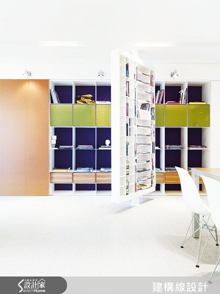 <書櫃與書架並存,兼顧美觀與遮蔽> 書櫃設計為隱蔽與開放兼具,留意兩者的比例分配,可以避免書櫃顯得雜亂又笨重,並且將書櫃分為上、中、下三個層次,中層採開放設計較佳,可方便拿取常看的書籍,而不常看的書可往上層與下層收納,採取封閉式設計增加美