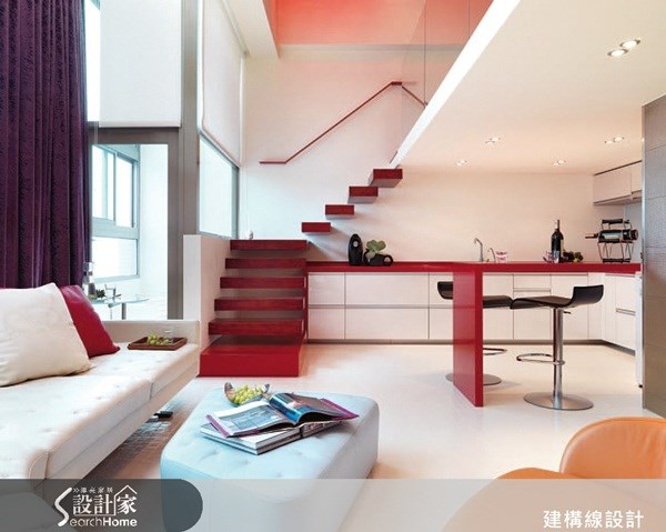 空間裡搶眼的紅色是屋主Vivian偏愛的顏色,設計師沈志忠當初一看到她就決定用紅色當作空間主色調,從牆面一樓延伸到二樓,再蔓延至天花板,透過水晶燈飾映照,在天頂開出隱約紅色雲朵,除了水晶燈沙發也挑了非常久才找到Vivian要的獨一無二款式,
