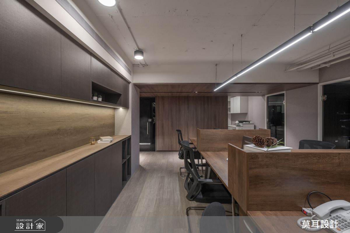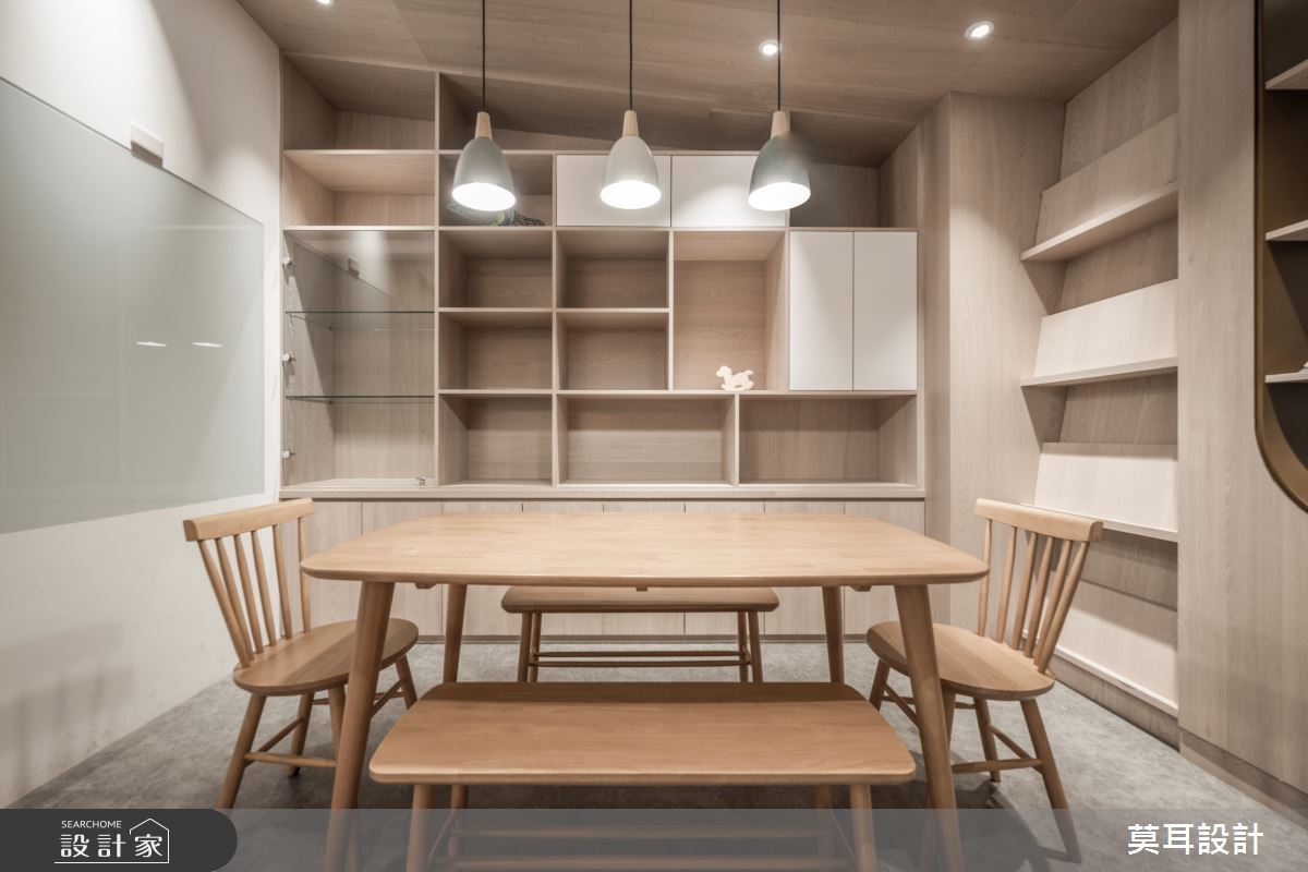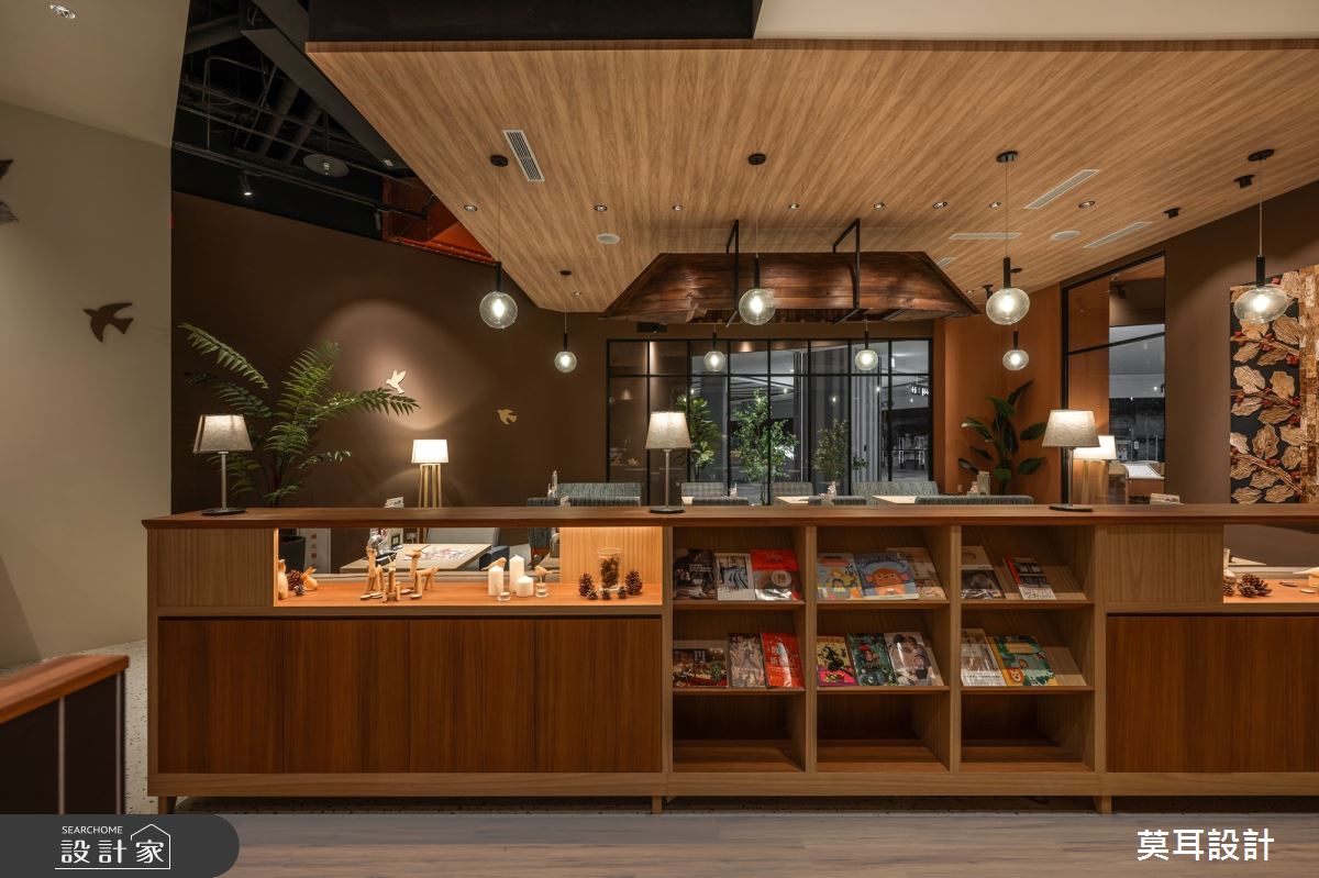 由莫耳設計精心規劃的140坪商業空間,因應業主需求,設計師運用混搭風作為主軸,搭配建材美耐板、實木、壁紙、塗料、皮革、布料、PVC地磚、玻璃,打造精緻品味的空間氛圍。