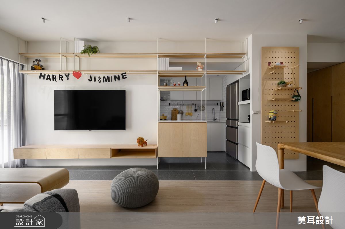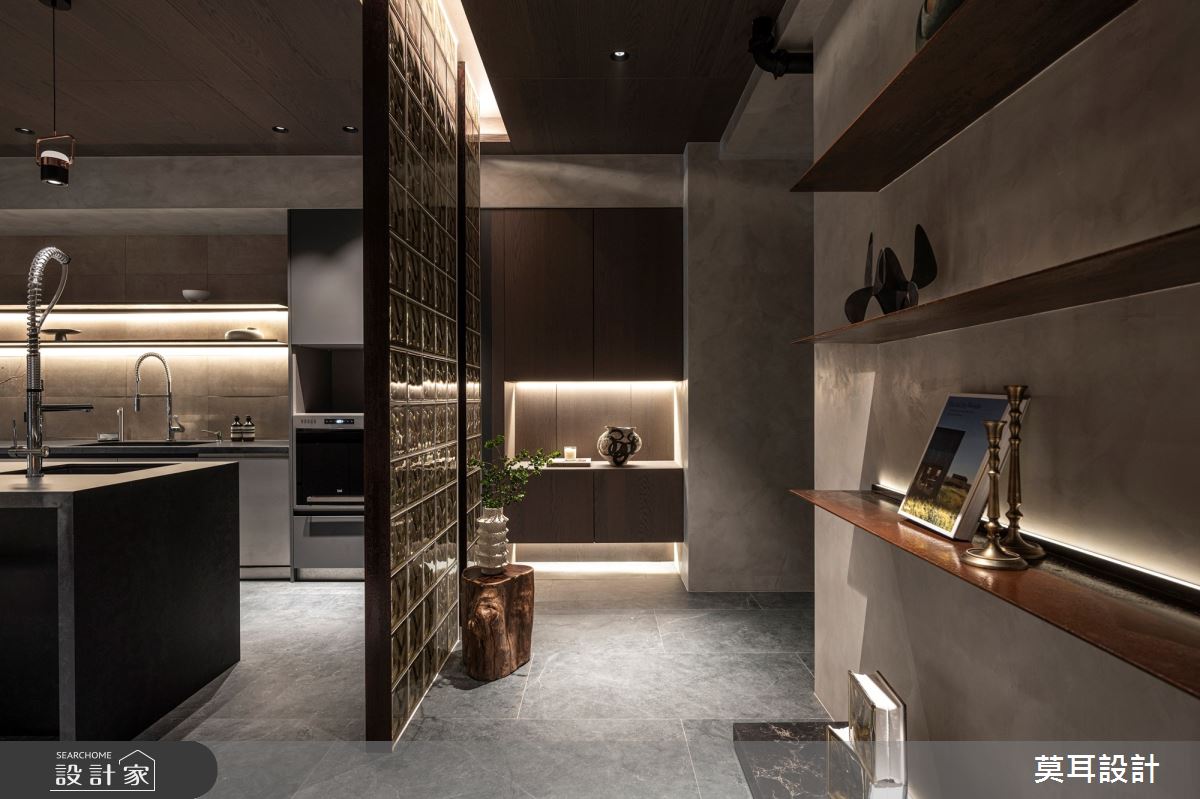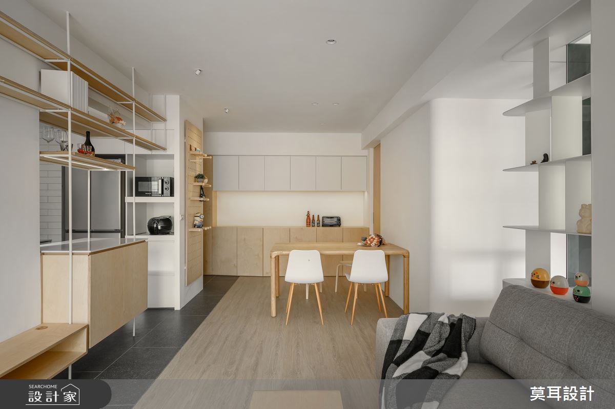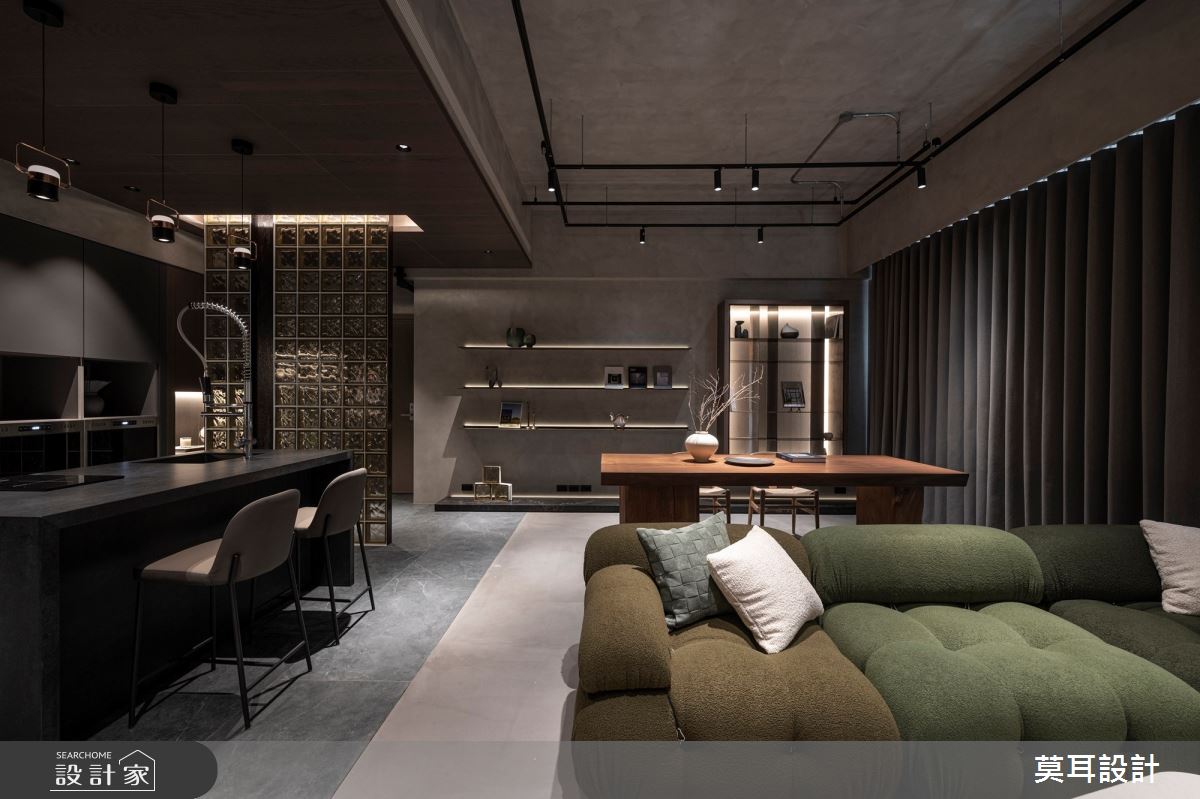 來自莫耳設計的35坪現代風住宅案,屋主一家人共有1位長輩,是一間新成屋(5年以下)的兩房格局,設計師藉由建材以乳膠漆、盤多磨、不鏽鋼、鐵件、茶玻、鋼刷木皮、系統板材、樂土、軌道燈、皮革、石材的搭配應用,實現一家人的理想生活。