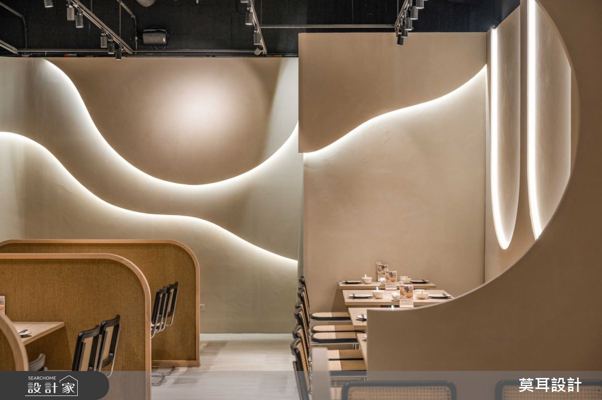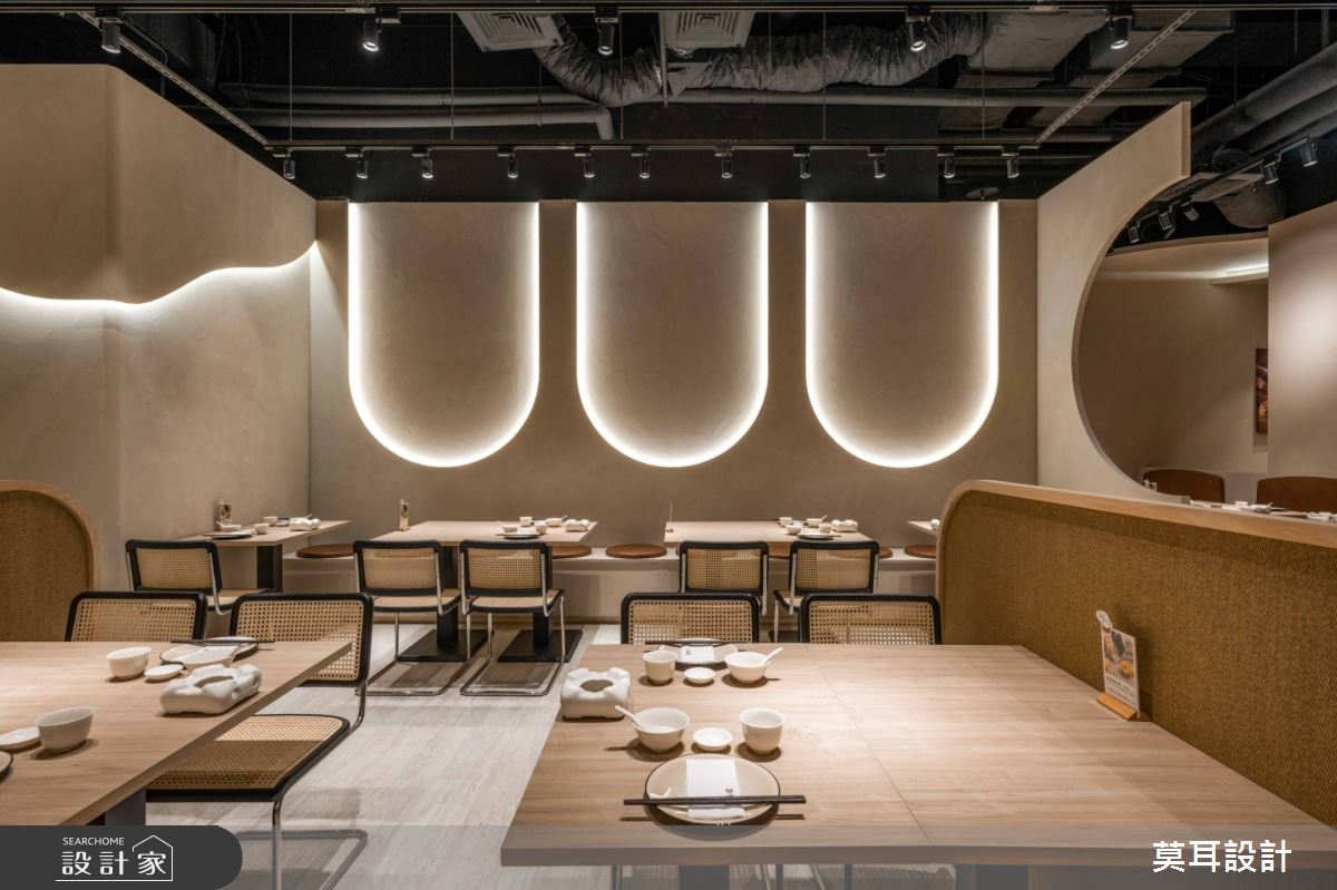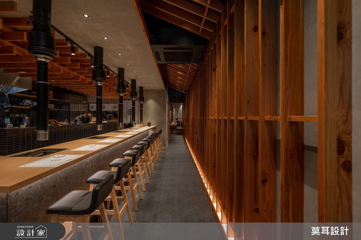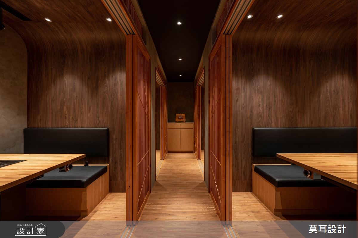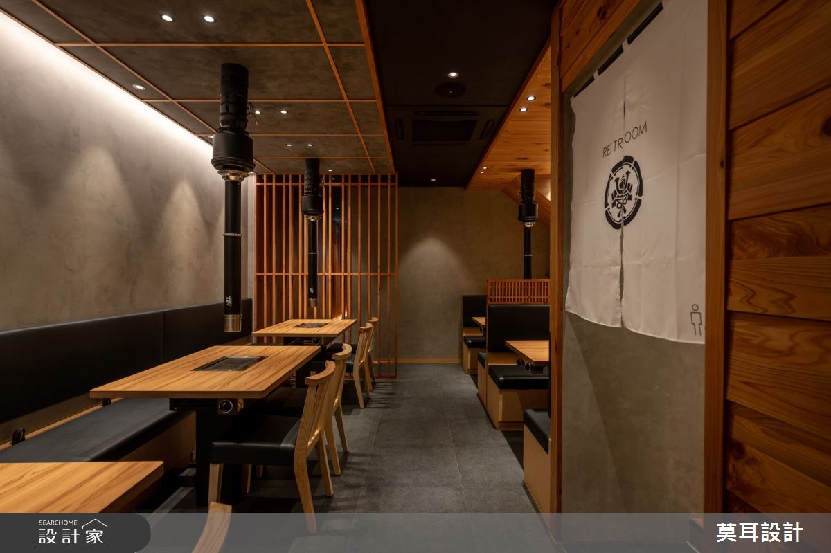 莫耳設計以實木皮、大板磚、磁磚、實木、美耐板、塗料、PVE地磚的搭配應用,呈現日式風的風格氣息,將此間50坪老屋(16~30年)優雅詮釋成舒適愜意的商業空間。