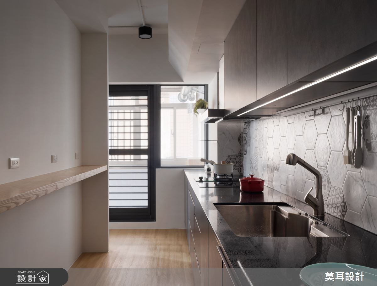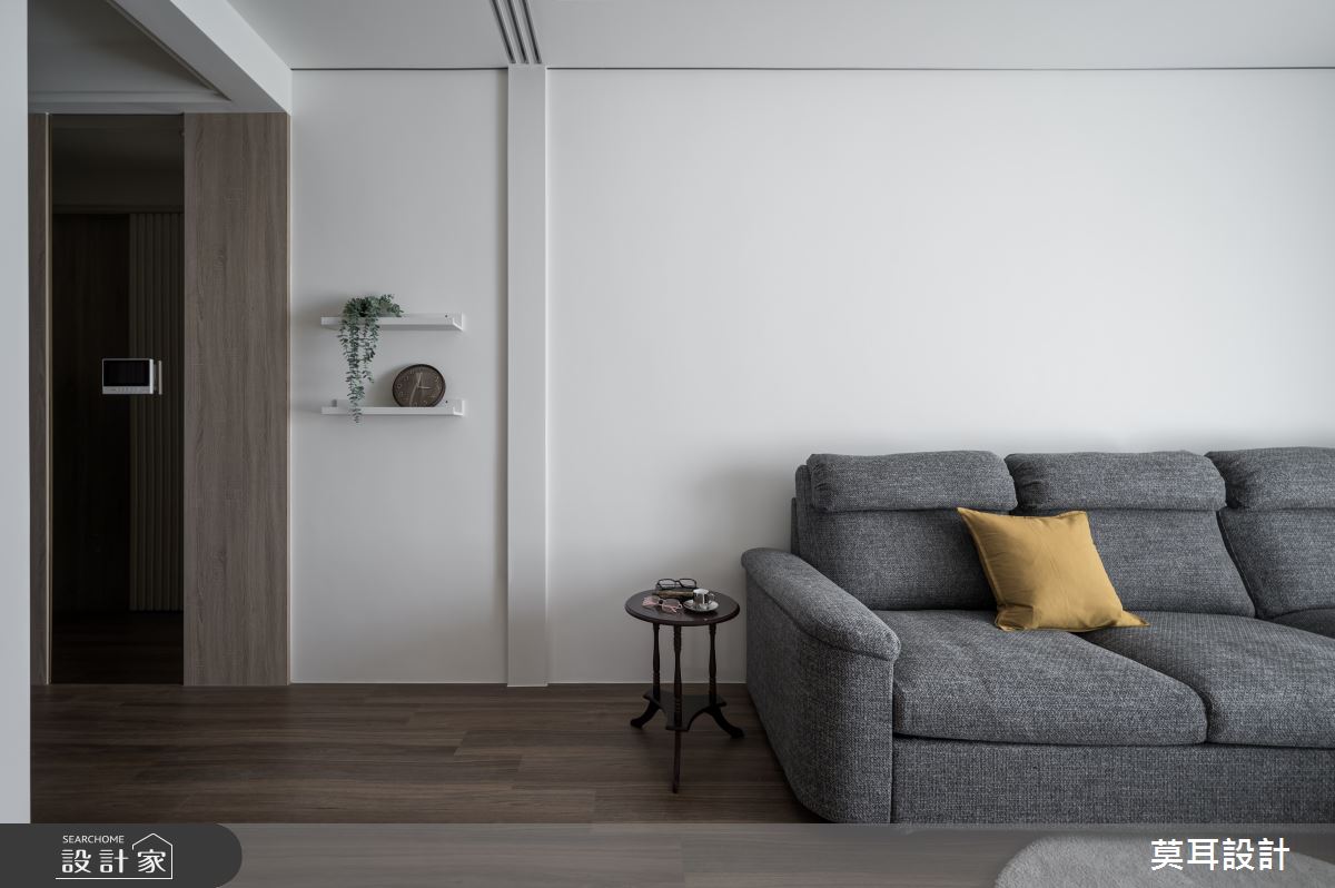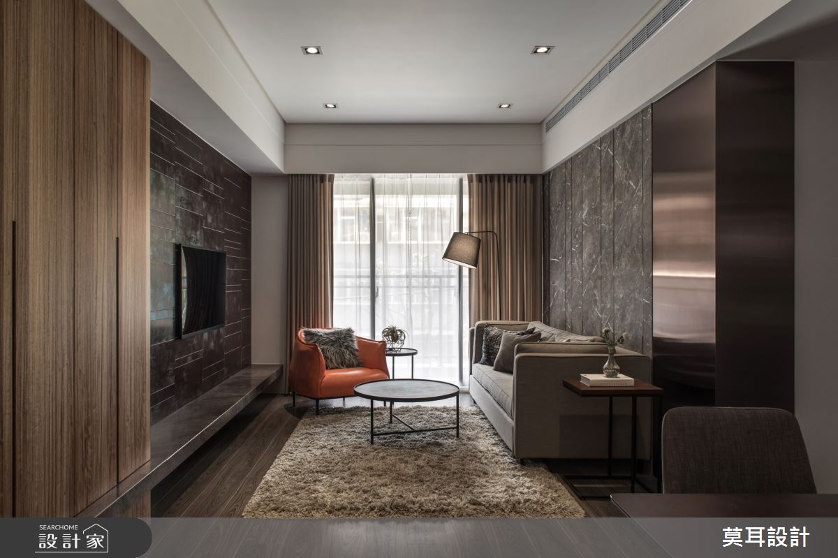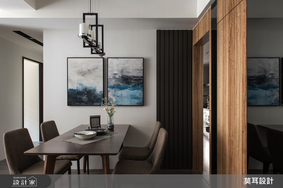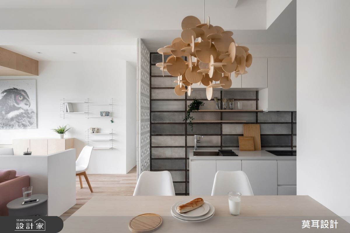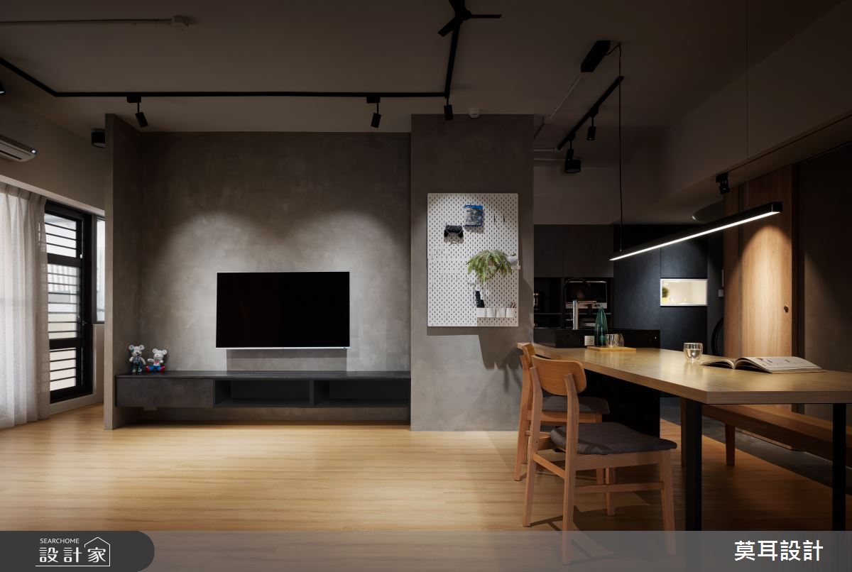 來自莫耳設計的35坪現代風住宅案,屋主一家人共有1位長輩,是一間新成屋(5年以下)的兩房格局,設計師藉由建材以乳膠漆、盤多磨、不鏽鋼、鐵件、茶玻、鋼刷木皮、系統板材、樂土、軌道燈、皮革、石材的搭配應用,實現一家人的理想生活。