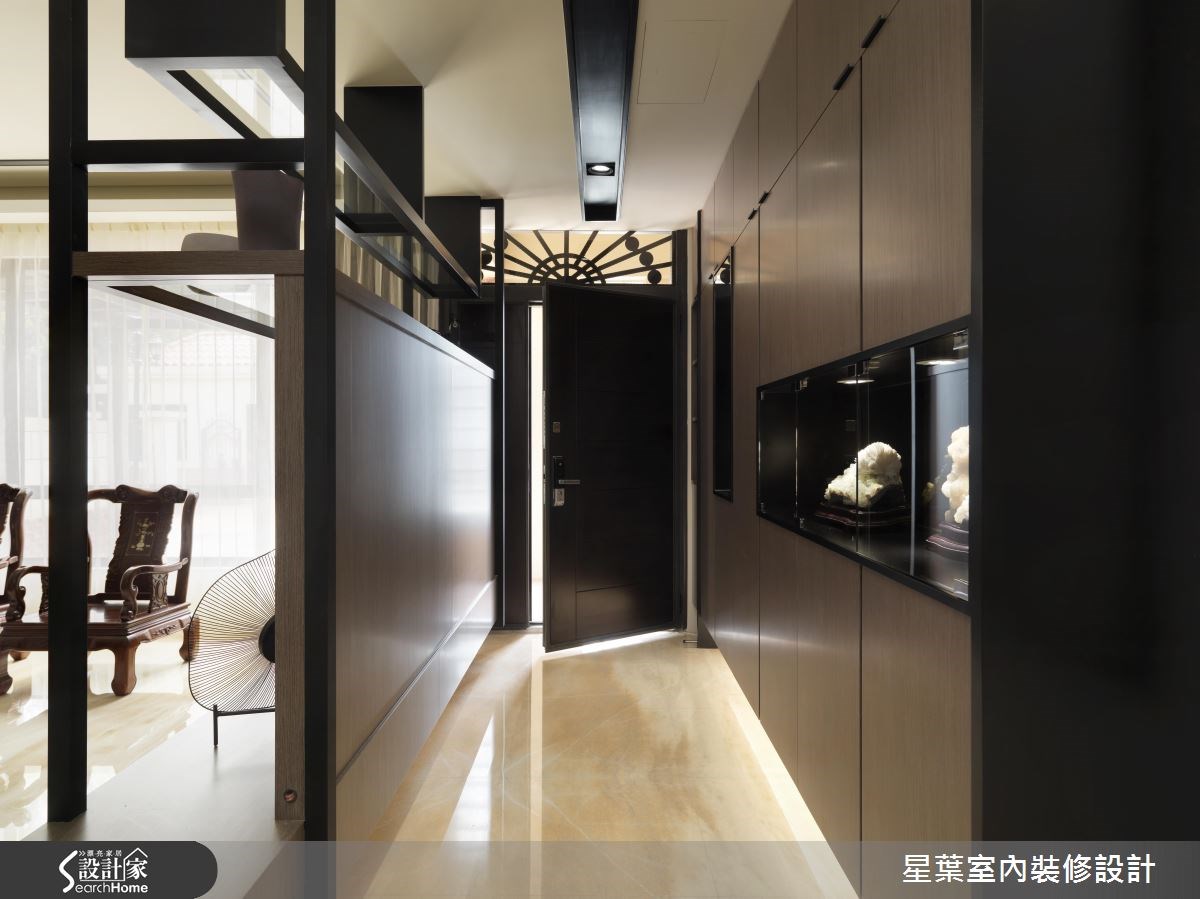 設計師保有建商局部設計並加以善用,為三層樓透天塑造典麗雍容特色,分別擷取東風禪意與西方新古典風韻加以結合,營造宛若 19 世紀上海租界處冠蓋雲集的流金年代。 電視牆與收納櫃之間長型設計的玄關,不僅為客廳空間保有隱私,更利用立體投射照明設計以及溫潤木皮,鋪陳大器十足的層次感;設計團隊利用復古風味實木桌椅作為客廳設計的構想起始,搭配奧羅拉大理石地坪與銀杏染白木貼皮的運用,為屋主夫妻延伸東西合璧的藝術人文風情。懸吊式電視牆有效降低視覺封閉性,營造輕盈的光透感,與後方鏤空格柵設計有著異曲同工之妙。客、餐廳之間以一道優雅的ㄇ字型拱道作為場域及風格的過度,水晶配件點綴於古典氣息的餐廚空間,善用透明式拉門阻絕油煙問題,同時無損於視覺美感與光源;主臥則利用金質皮革裱布與釘扣造型,營造飯店般的優雅風格。 小編的最愛 「線條」運用亦為該案的設計重點,設計團隊在居宅各處以垂直、平行的線條交錯與延伸,如電視吊櫃的鐵件交織、大門上方的綻放設計與客廳天花線板的框設,體現了千變萬化的線條美感。