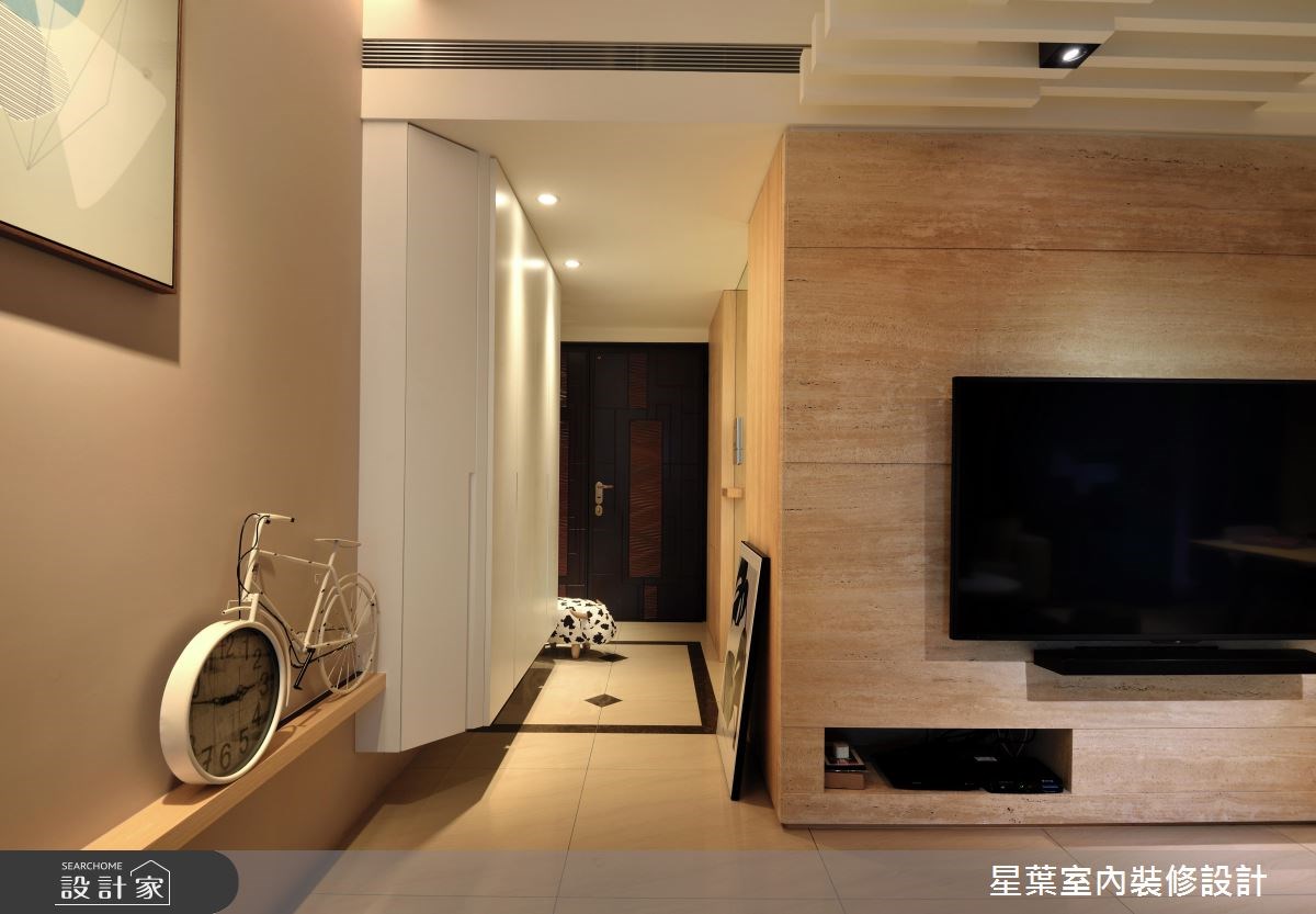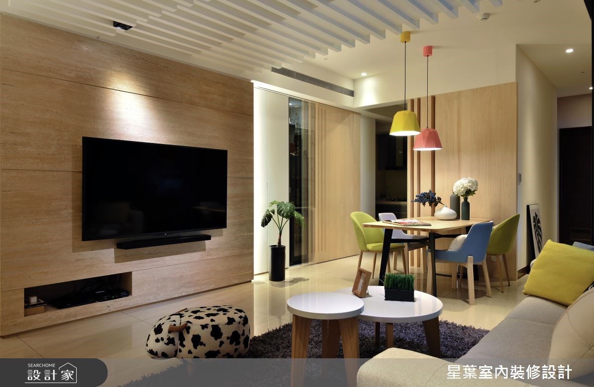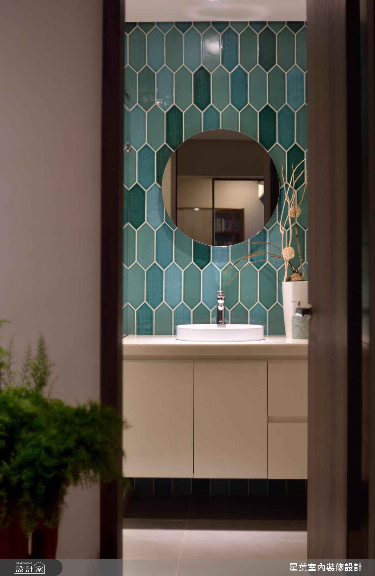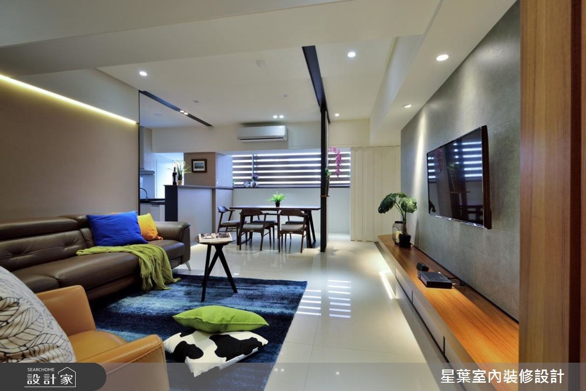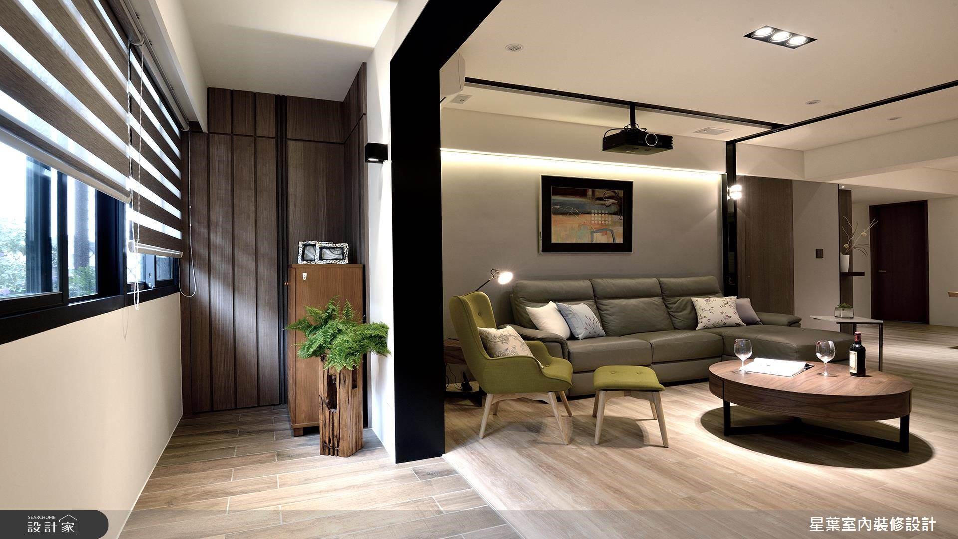 34 坪的老屋,在星葉設計翻新改造後,不但滿足了生活中的機能需求,更加設了大投影幕、投影機等影視設備,並運用大量木質元素和俐落的線條修飾,營造出溫潤而時尚的休閒風居所。 走進這處單層住宅,地板及牆面藉由木皮、木地板的安排,滿溢著木質感的溫馨暖度,玄關處則鋪排同樣具有自然質理的木紋磚,更能達到耐髒、耐磨的實用性。開放式的廳區,在天花板加入了俐落的燈溝線條,帶來時尚俐落的空間感受,另一端位置安排為一家人團聚用餐的餐廳,並連結獨立的書房空間,平時也能成為開放式的閱讀區,而透過玻璃隔間的設計,讓空間既能保有隱私,也達到與家人互動的多重機能性。私領域臥室則以沉靜低調的紫色和木質為基調,並在床頭處加置玫瑰金色的吊燈,溫馨地散發著具有優雅暖度的光芒。 小編的最愛 盥洗區也十分特別,設計師在洗手台牆面上,利用如寶石般的藍綠色六角磚作為裝飾,營造出時尚又繽紛的視覺亮點。
